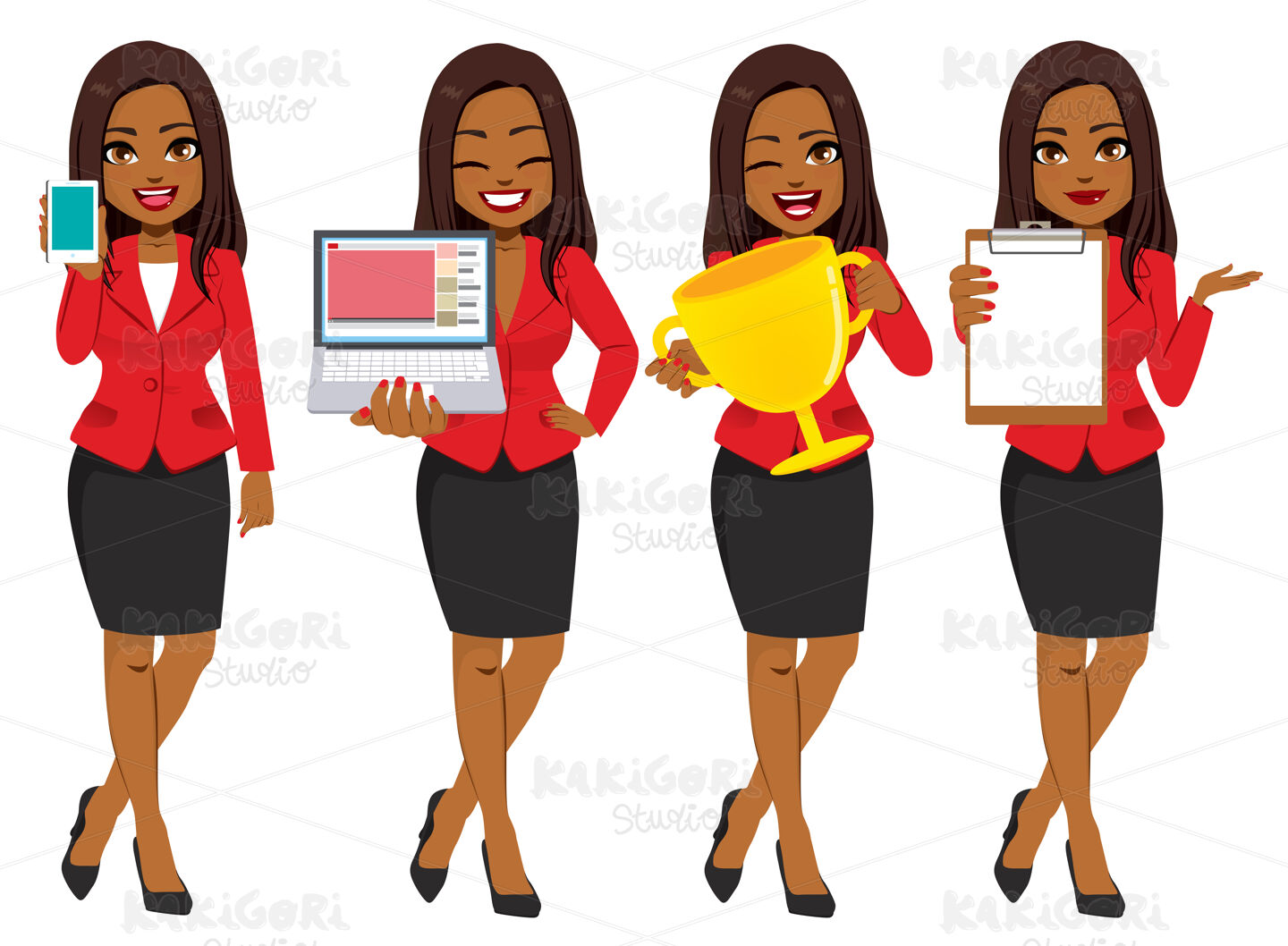 Beautiful young African American Black businesswoman set collection standing holding different object