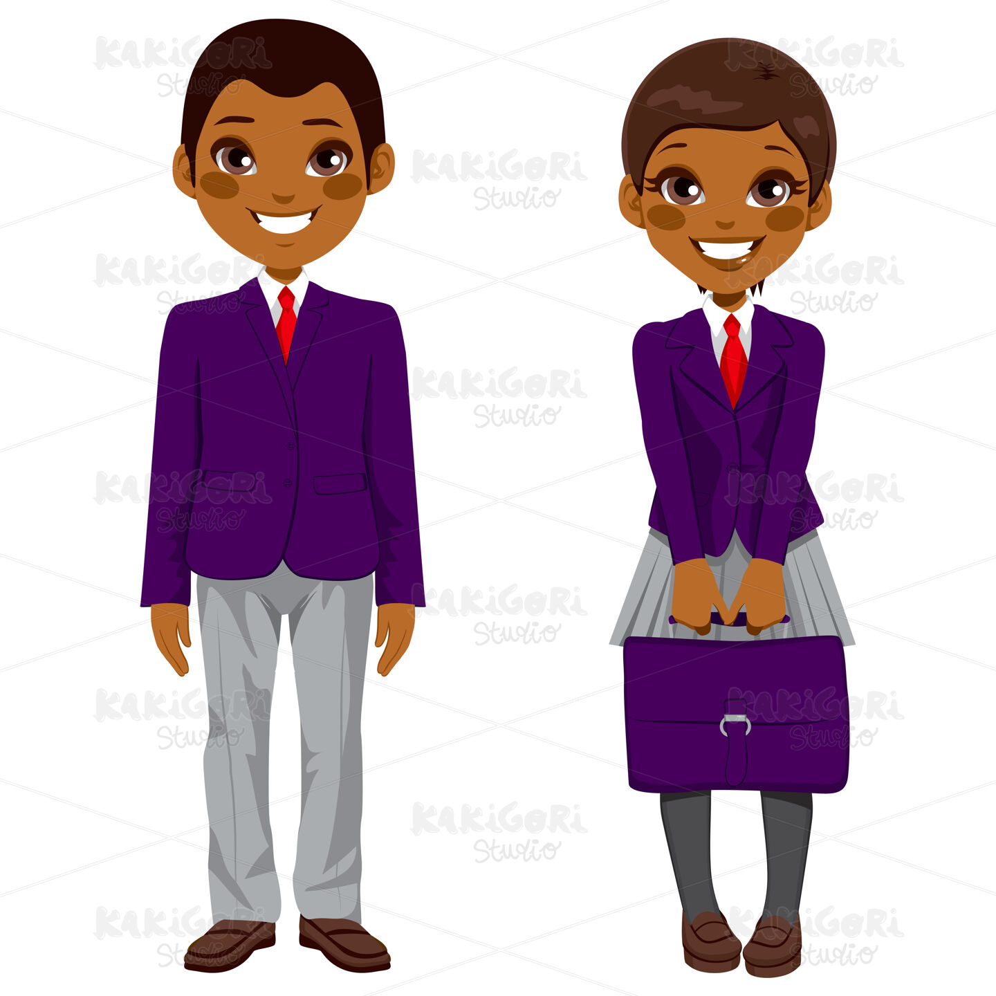Two cute African American teenage students standing together with uniform and holding suitcase