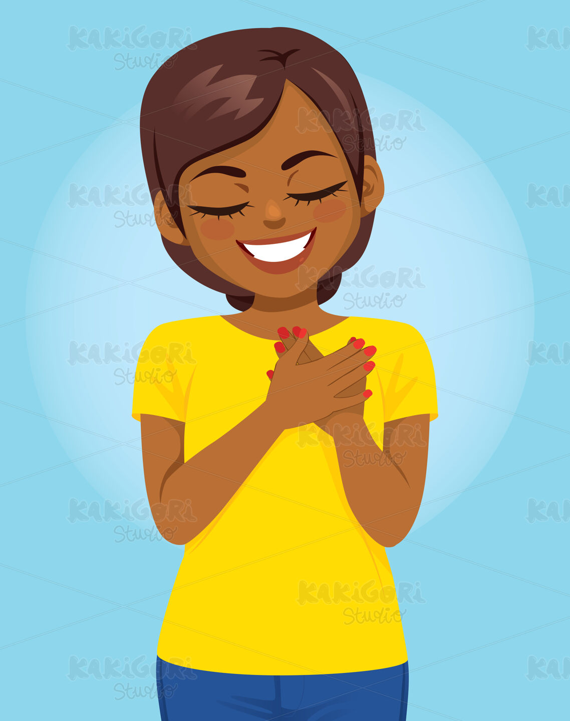 Young African American woman with hands on heart making lovely grateful face expression gratitude gesture