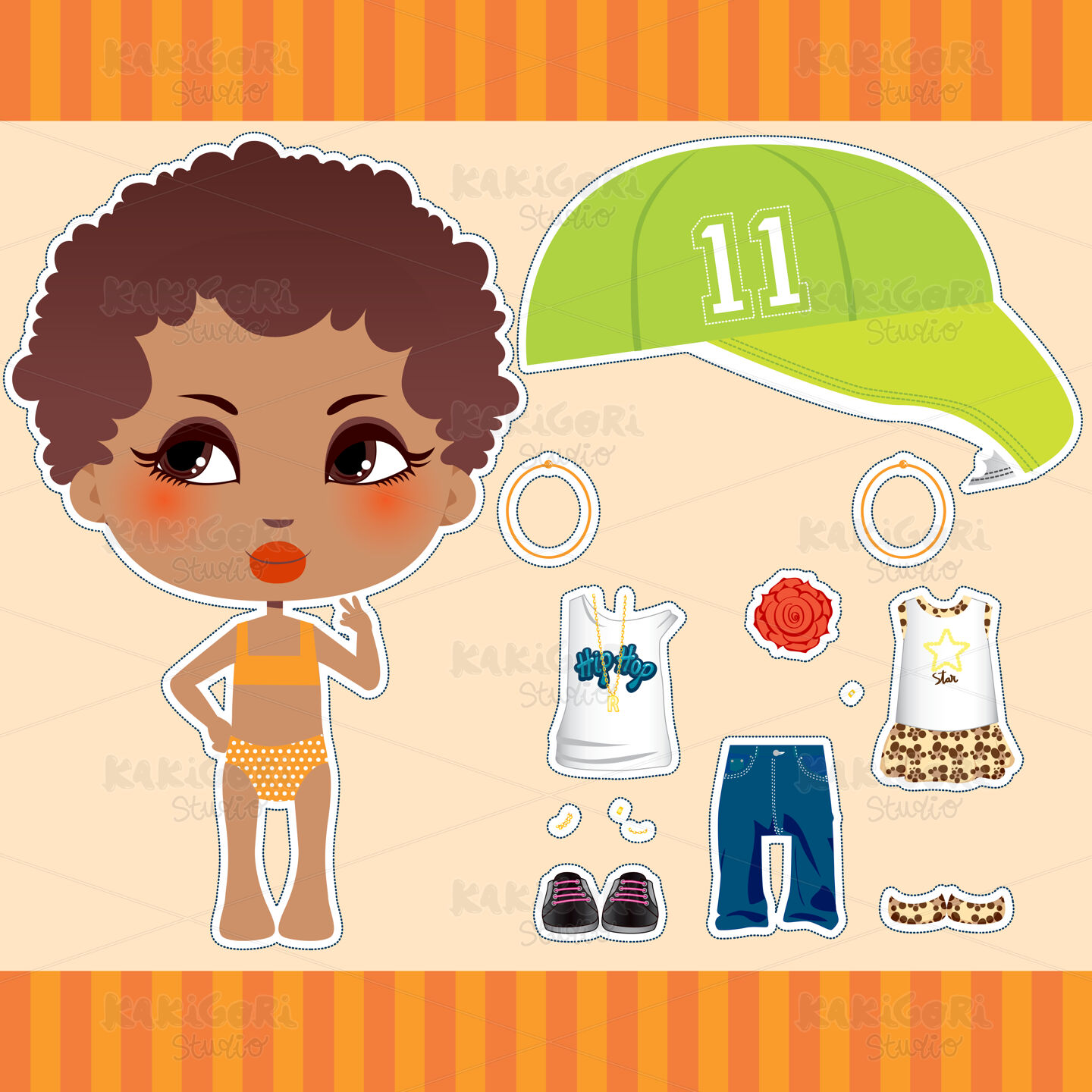 Cute Afro American fashion paper doll girl clothes collection set