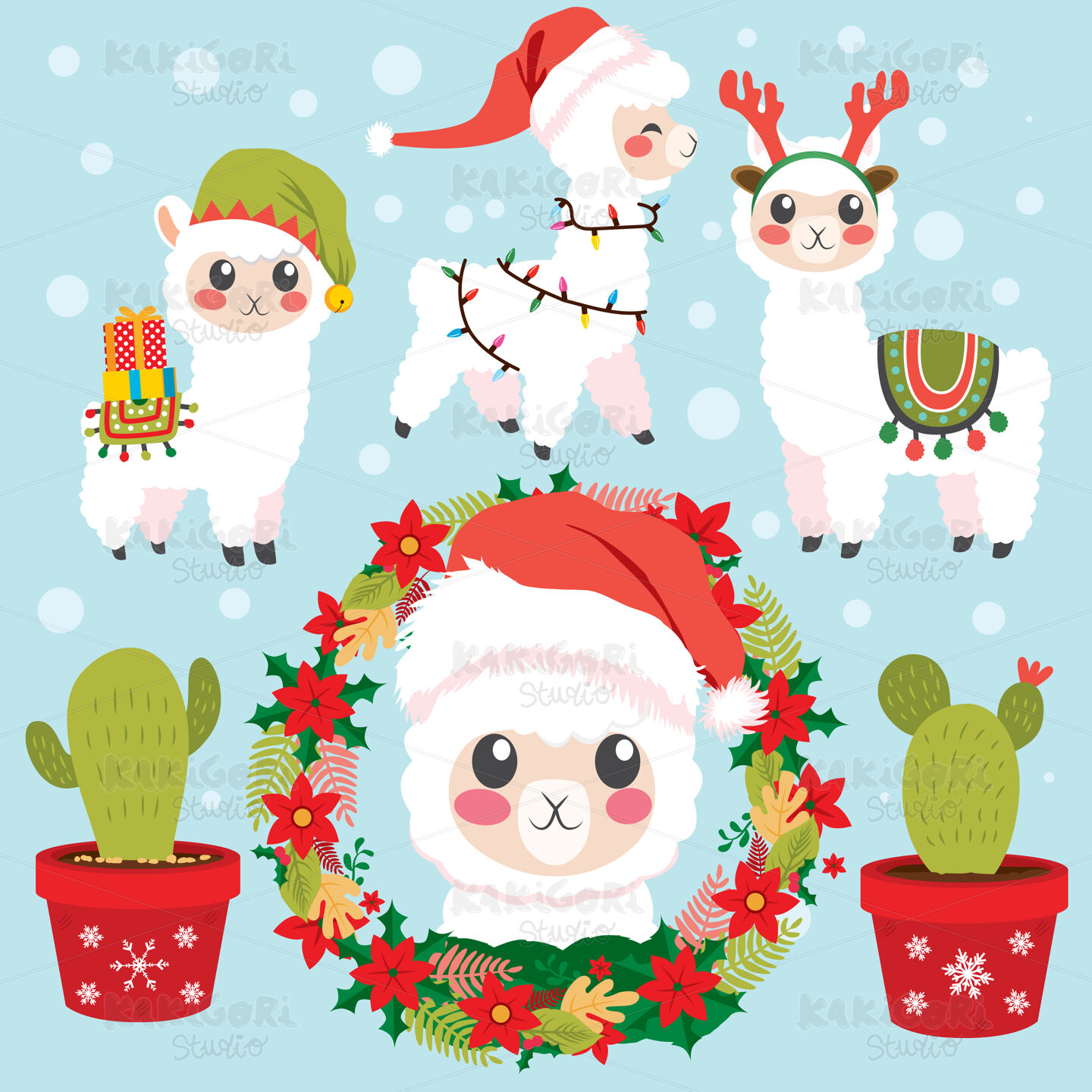 Christmas decor elements collection of different funny alpaca with Santa hat, presents and cactus