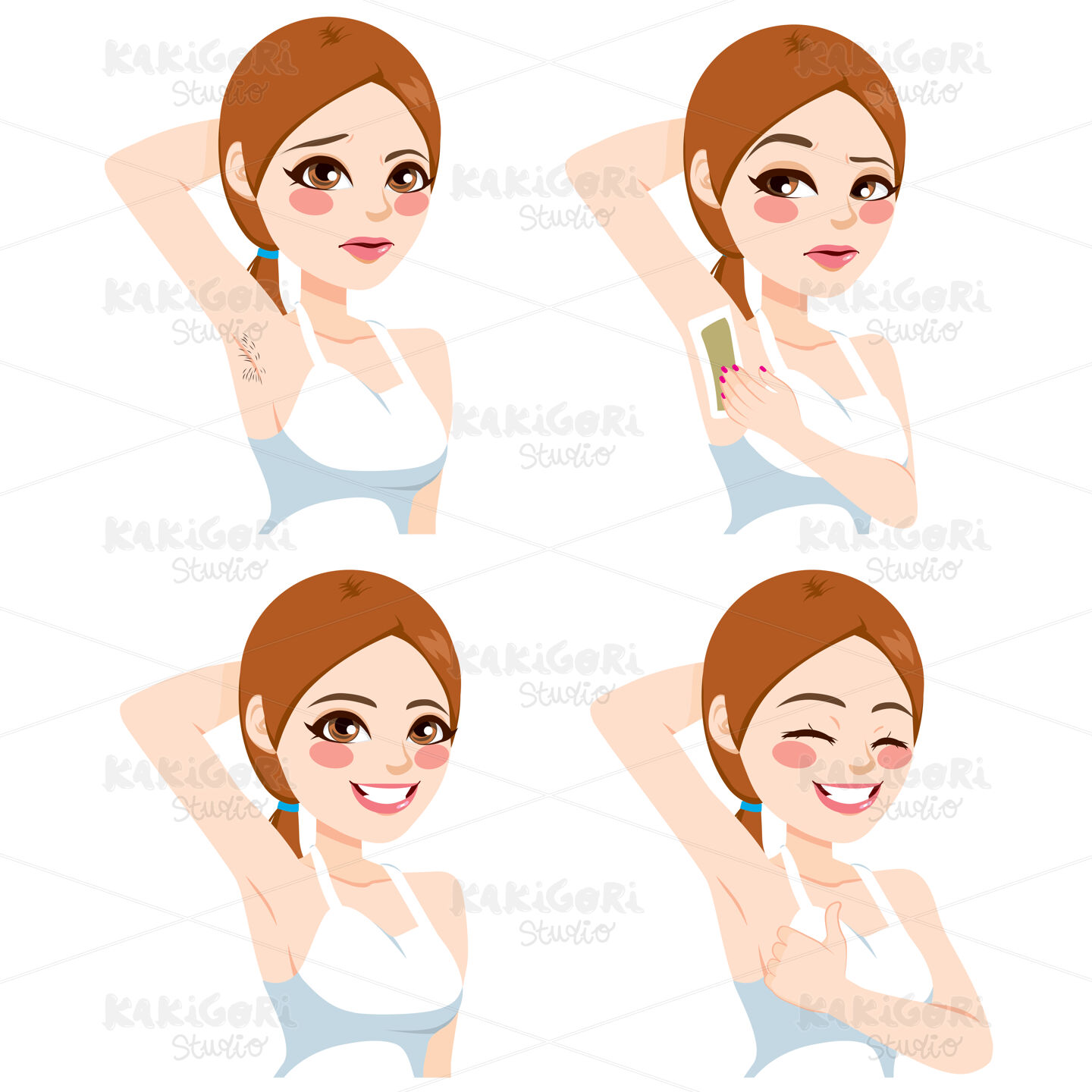 Beautiful young woman on four different action waxing armpit with cold wax strip hair removal