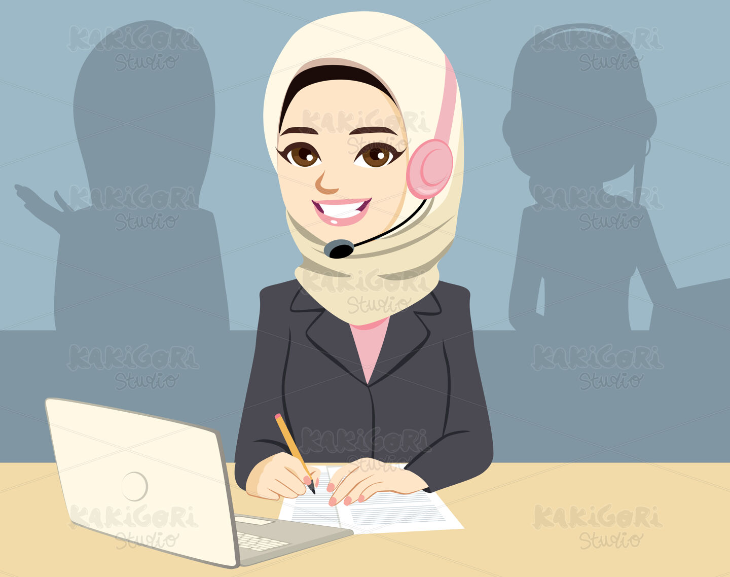 / Asian Muslim Call Center Woman Clipart Vector Illustration 05418