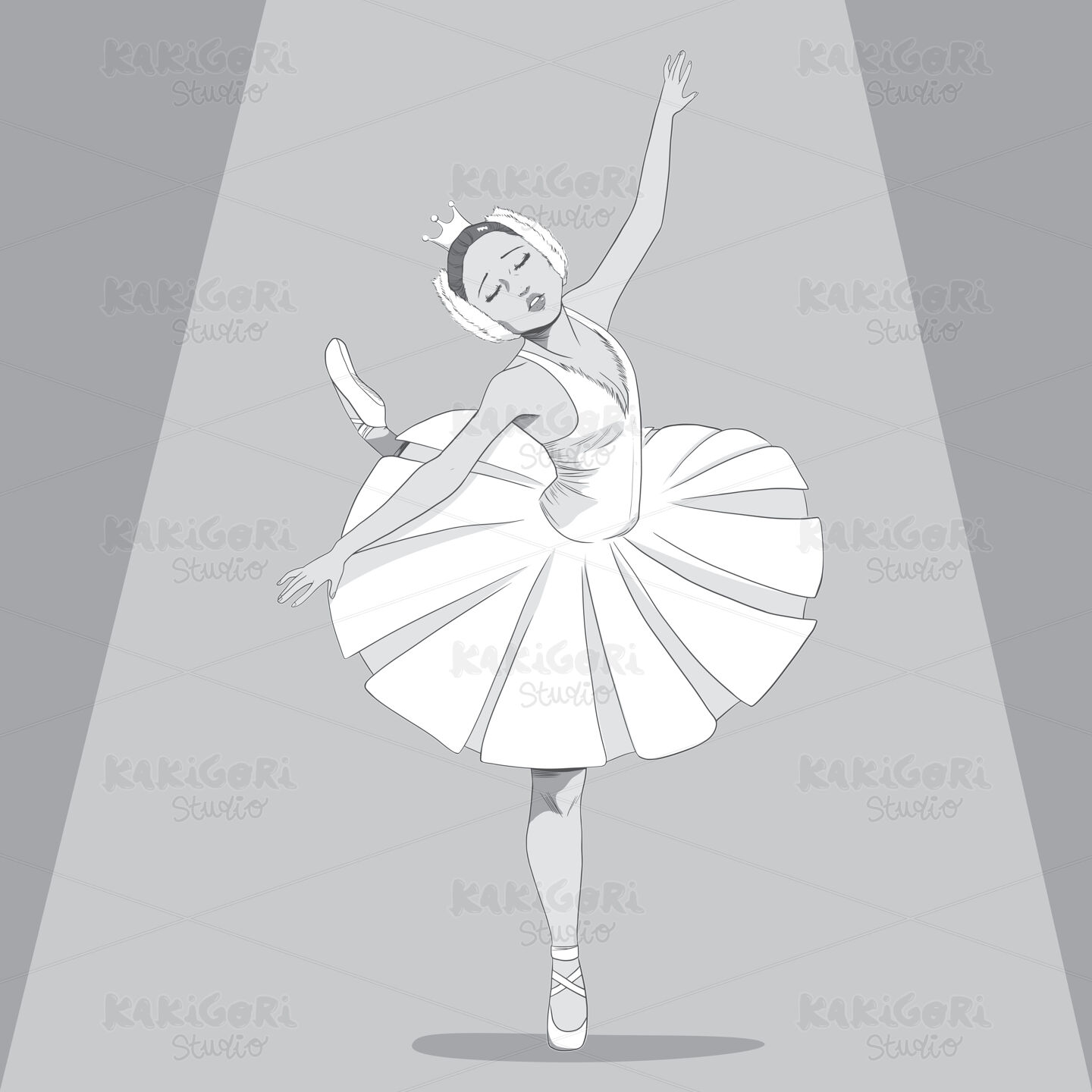 Black & White drawing illustration of a ballerina dancing swan lake ballet with sad expression under spot light