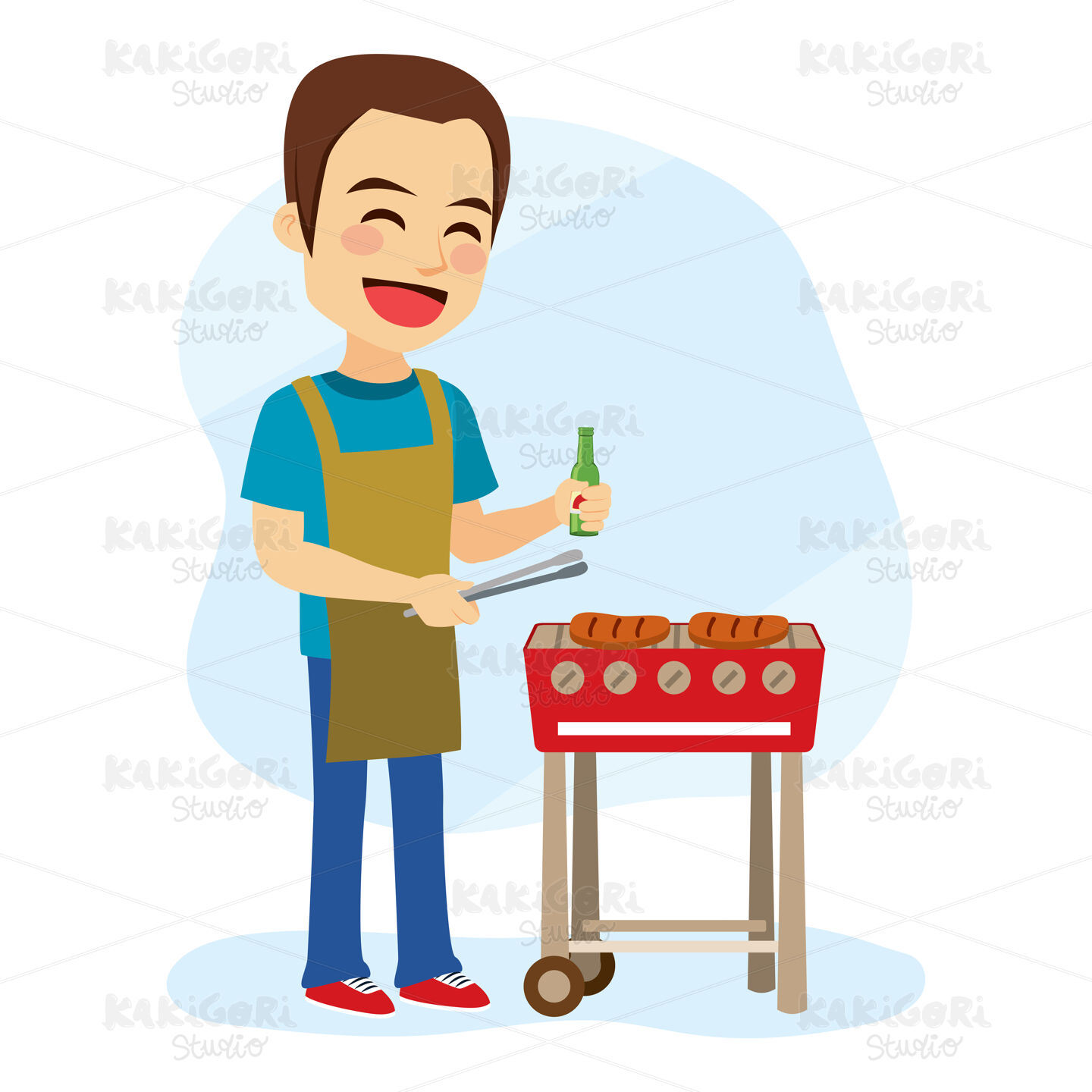 Young caucasian cheerful man cooking hamburger on barbecue grill