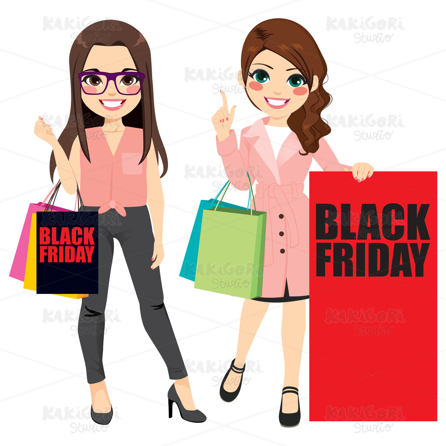 Beautiful fashion girls with shopping bags and two different clothing style on black friday event
