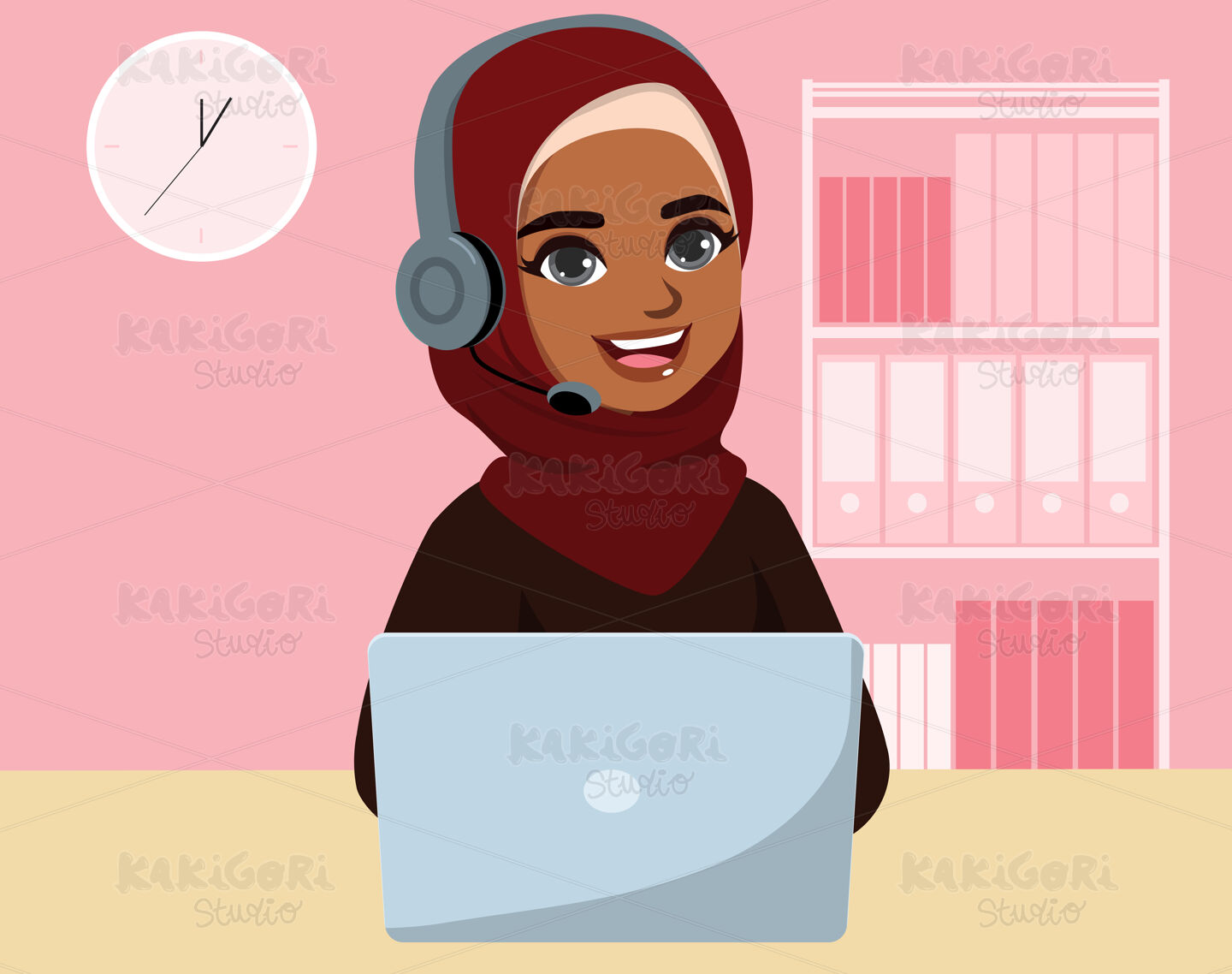/ Black Muslim Call Center Woman Clipart Vector Illustration 05417