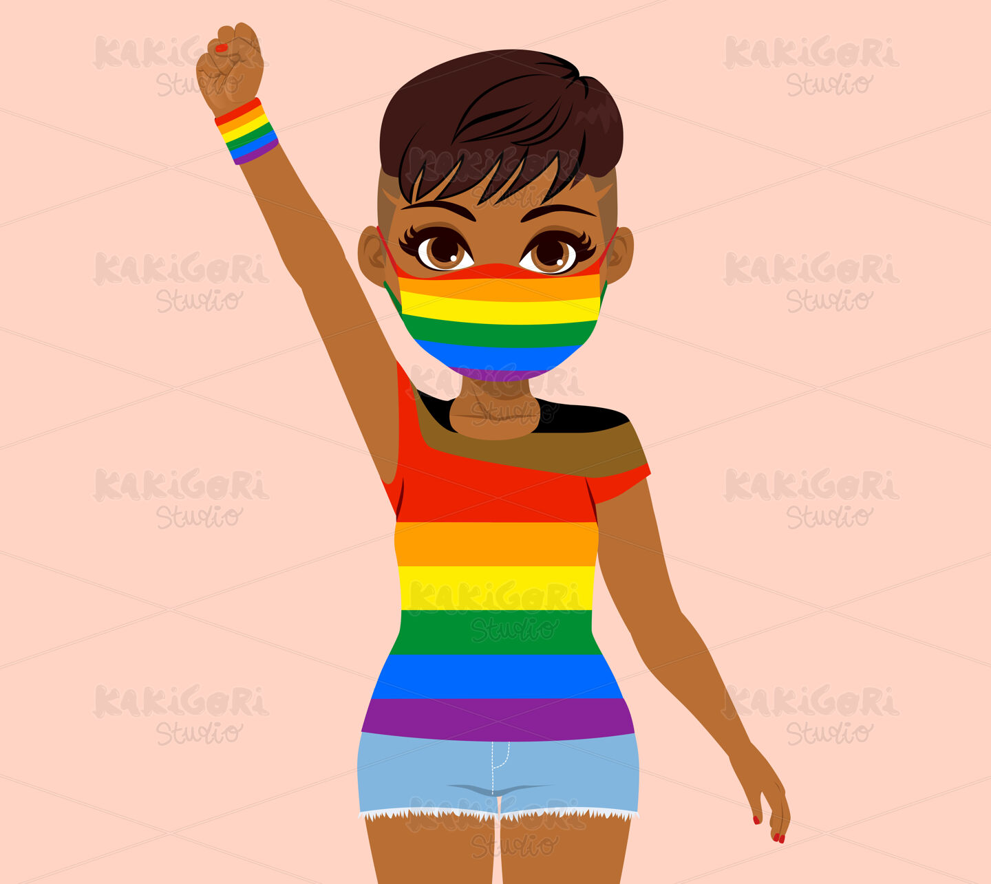 Beautiful young black African American woman with LGBT rainbow flag shirt mask and wristband fist up