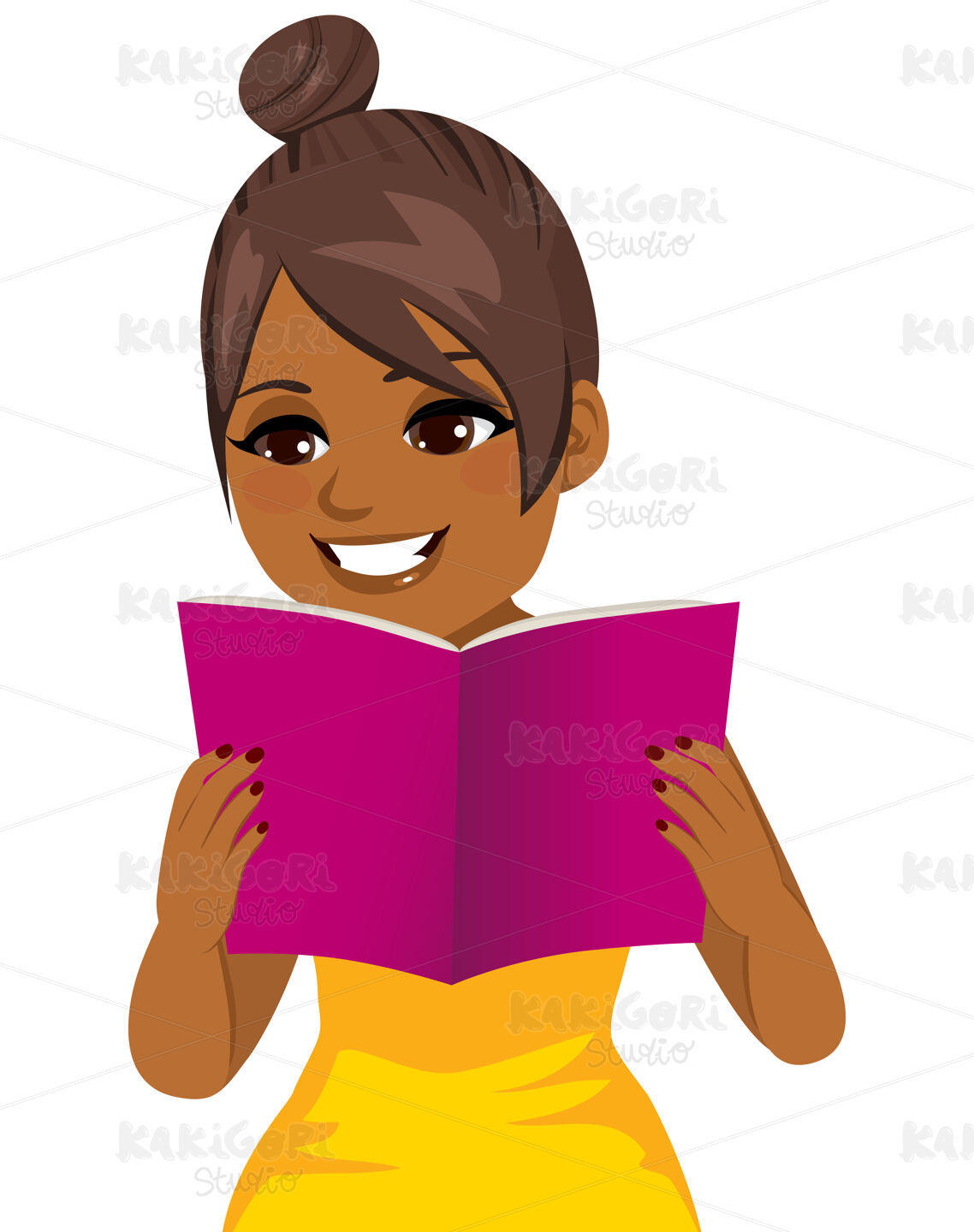Young woman happy smiling focused reading holding book with both hands isolated vector illustration