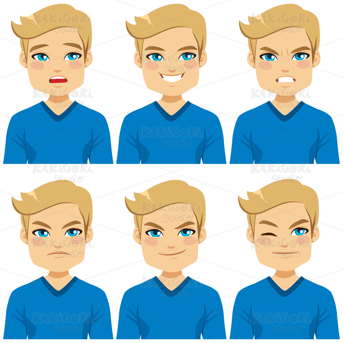 Attractive blond hair young man on six different face expressions collection with blue shirt