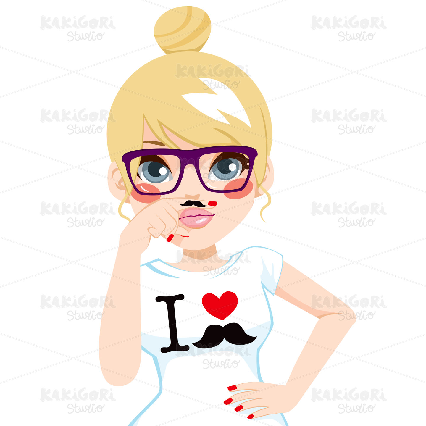 Funny blonde hipster girl making faces pretending to have fake mustache in finger wearing white shirt with I love mustache print design and glasses