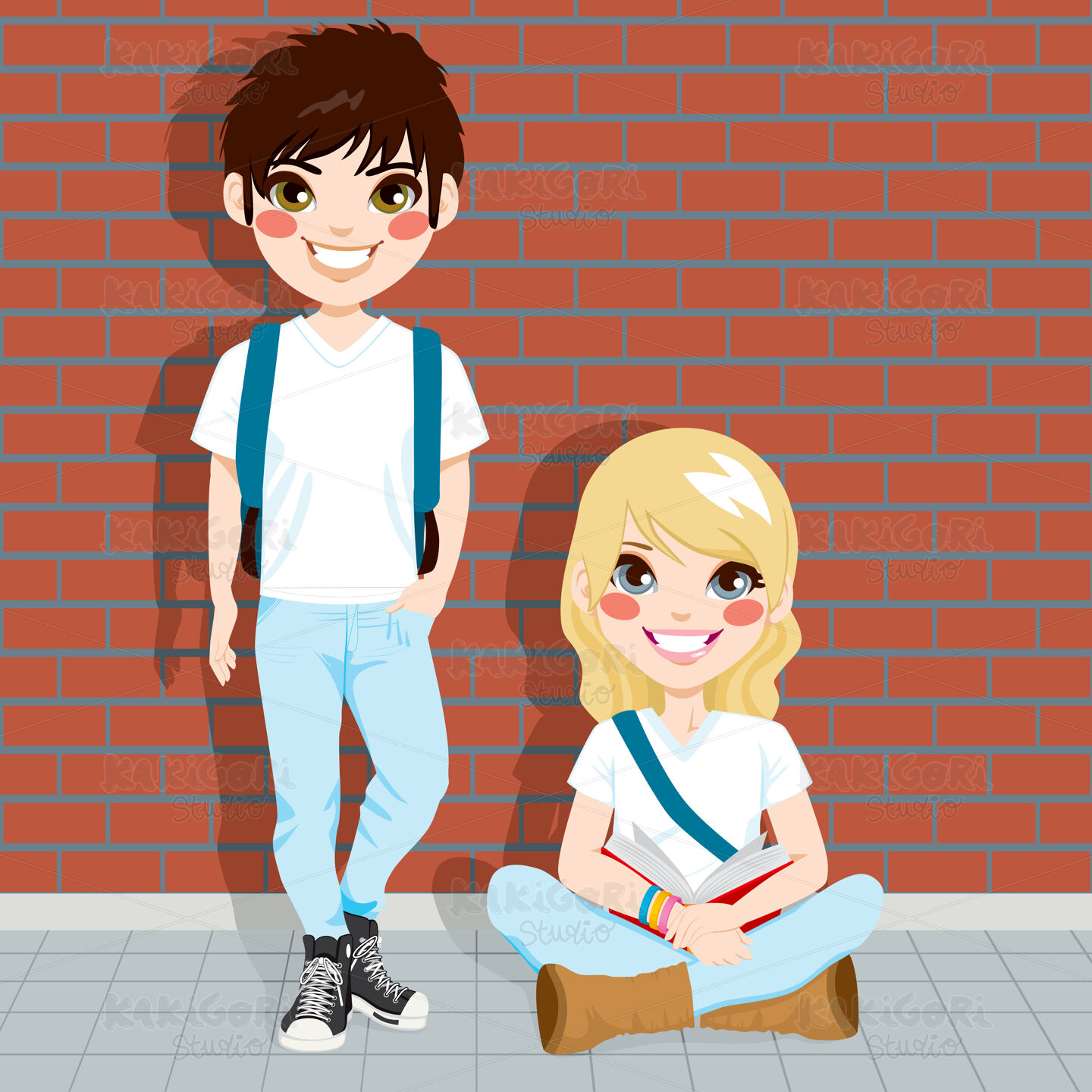 Young teenager brown haired boy with white shirt and blue jeans standing with blonde teenager girl sitting on floor