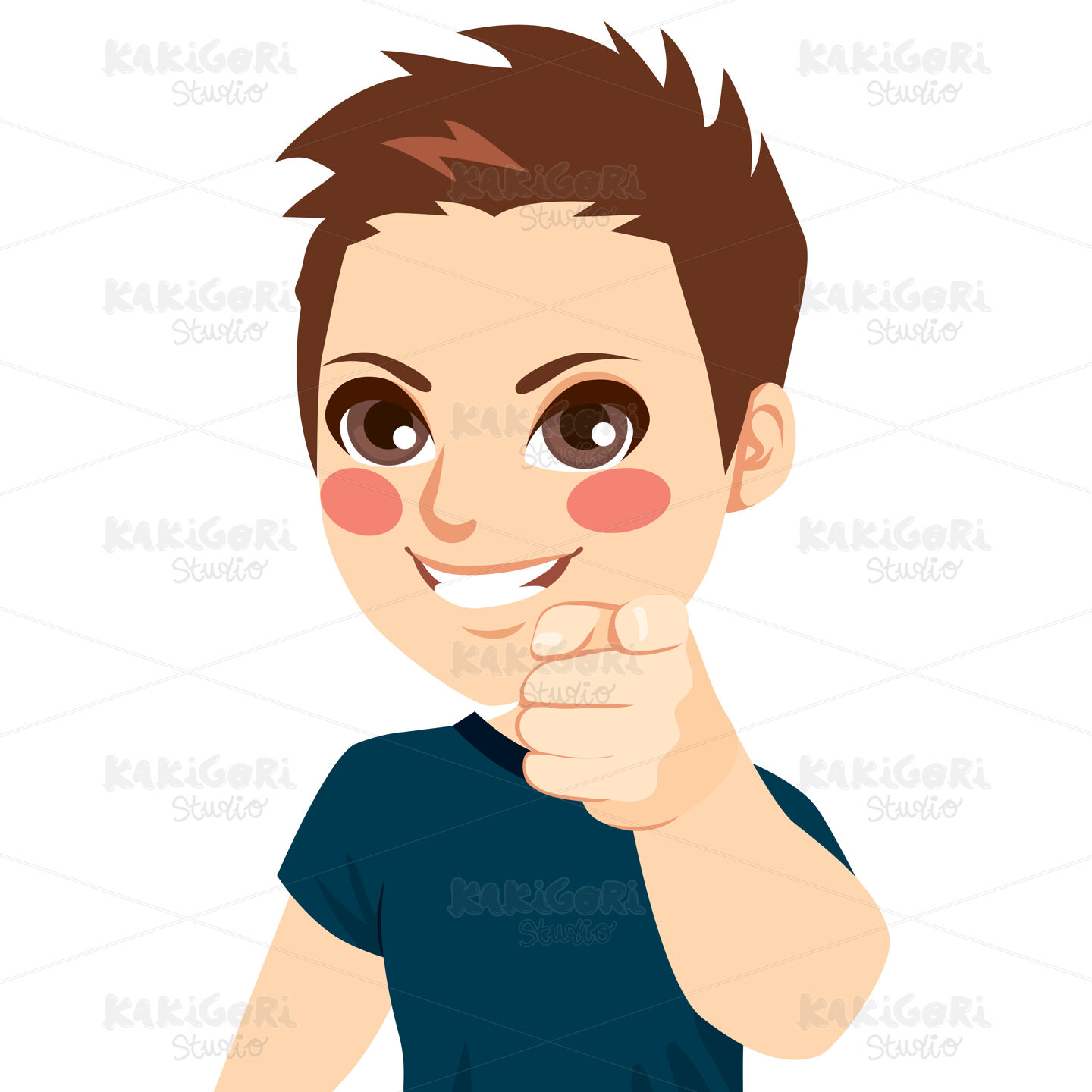 Portrait of happy positive young teenager boy smiling pointing with finger something