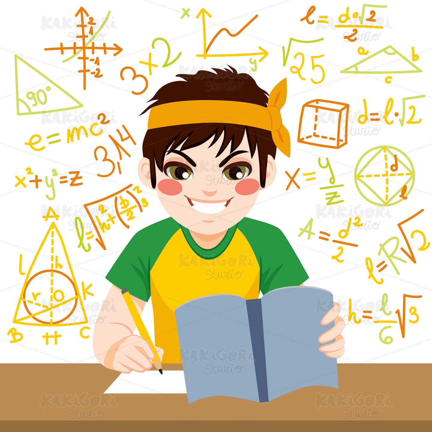 Young teenager boy studying hard mathematics exam with notebook surrounded by formulas