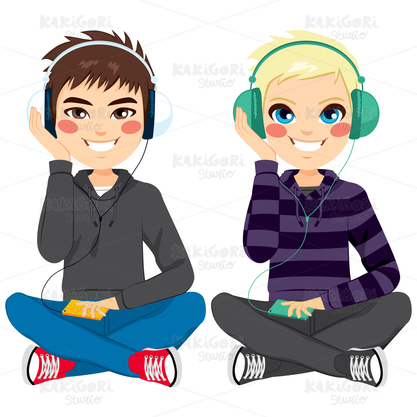 / Boys With Headphones Sitting Clipart Vector Illustration 02889
