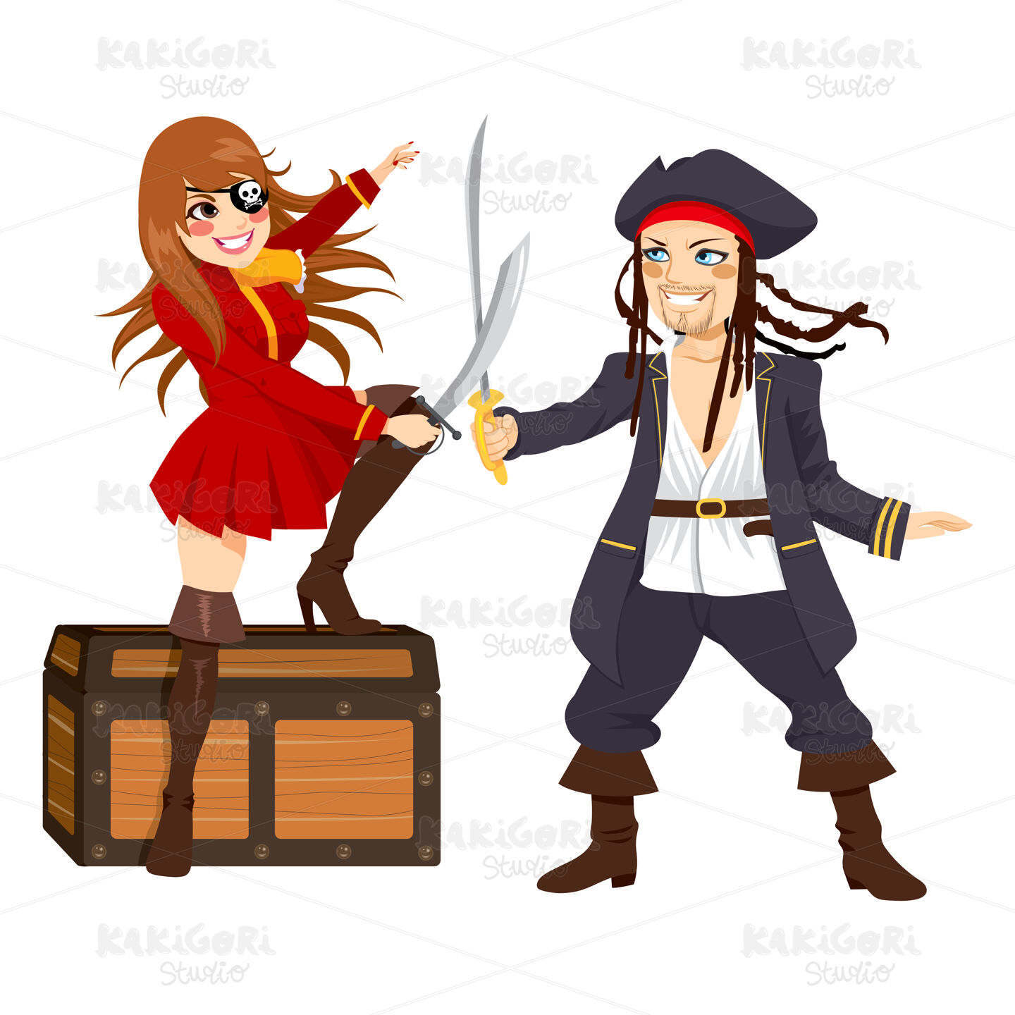 Two brave pirates, one male and one female, fighting with swords over treasure chest