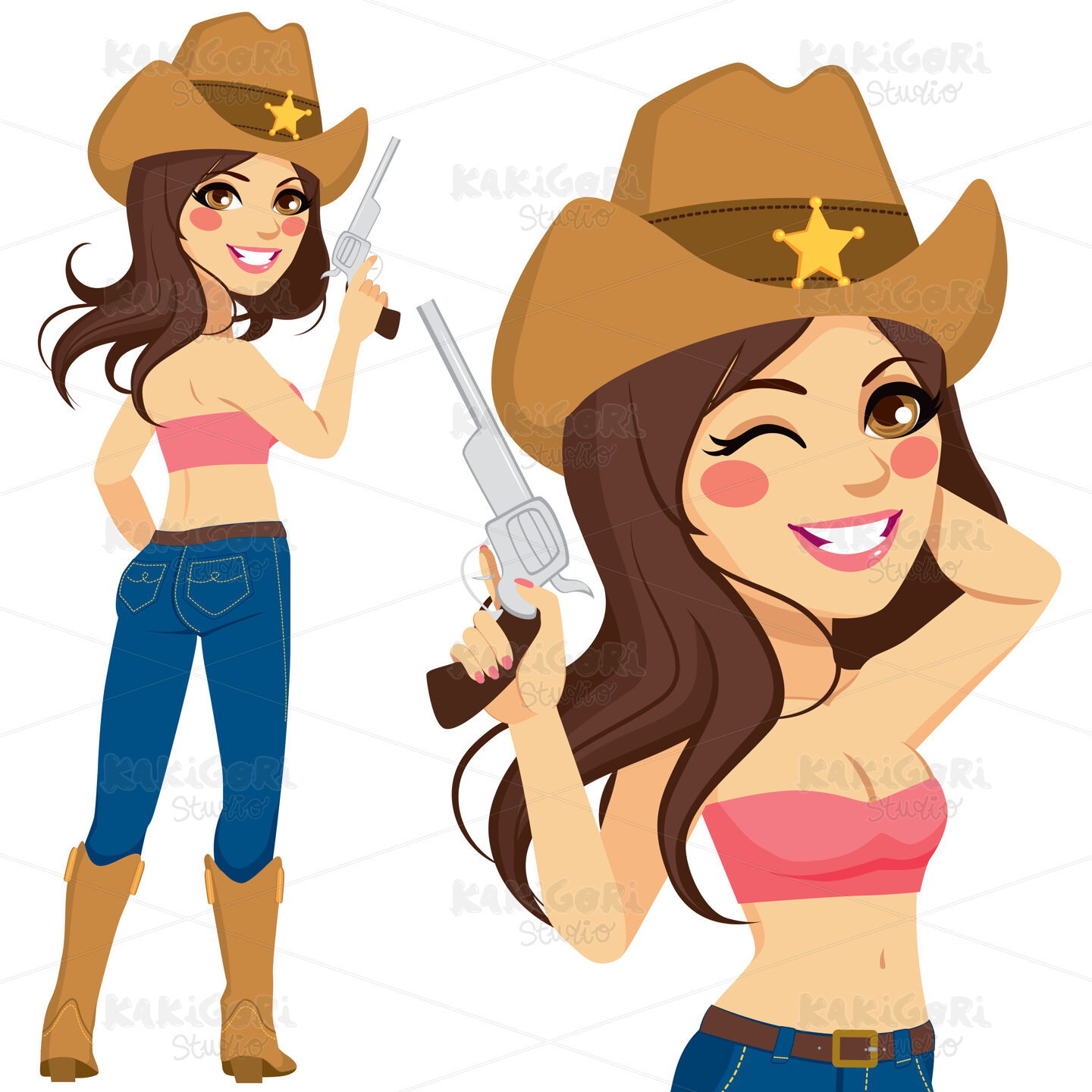 / Brunette Cowgirl With Gun Clipart Vector Illustration 02087