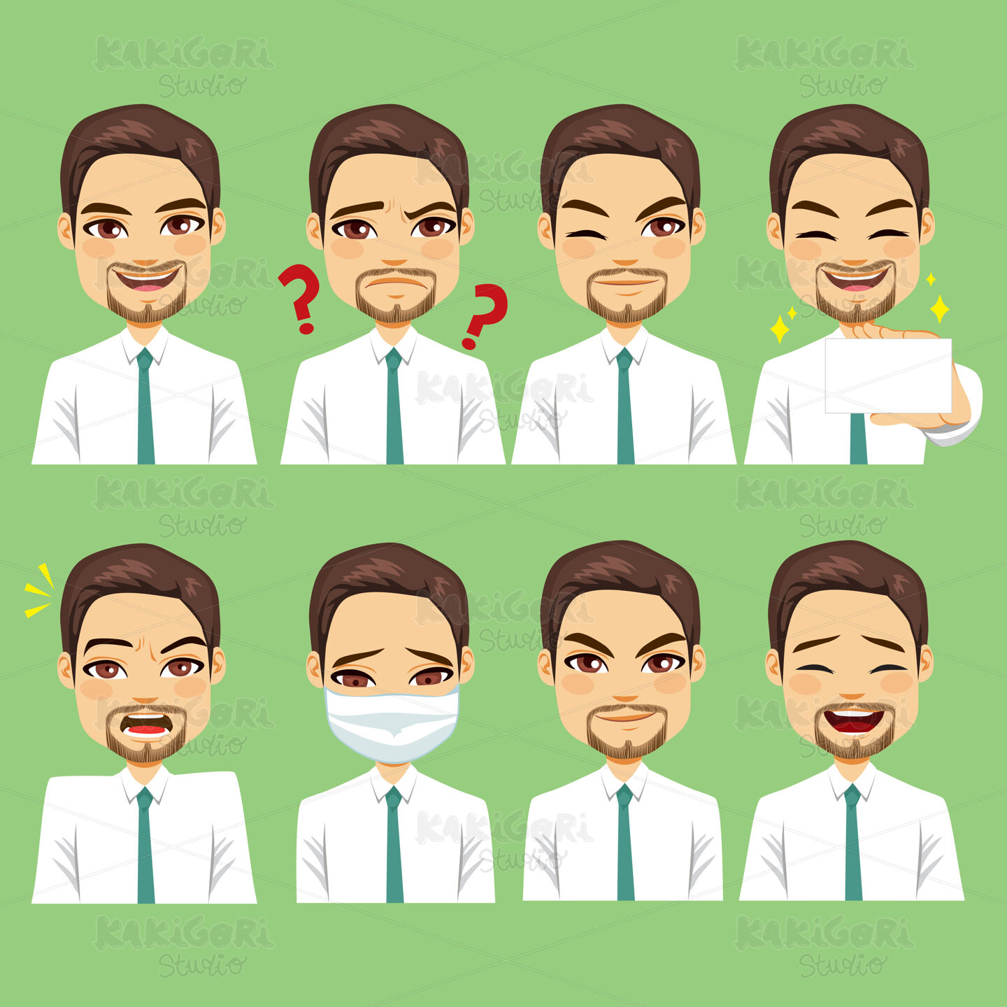 Young businessman funny avatar expressions on green background