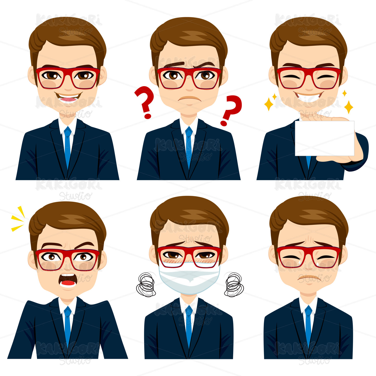 Handsome brown haired young adult businessman on six different face expressions collection
