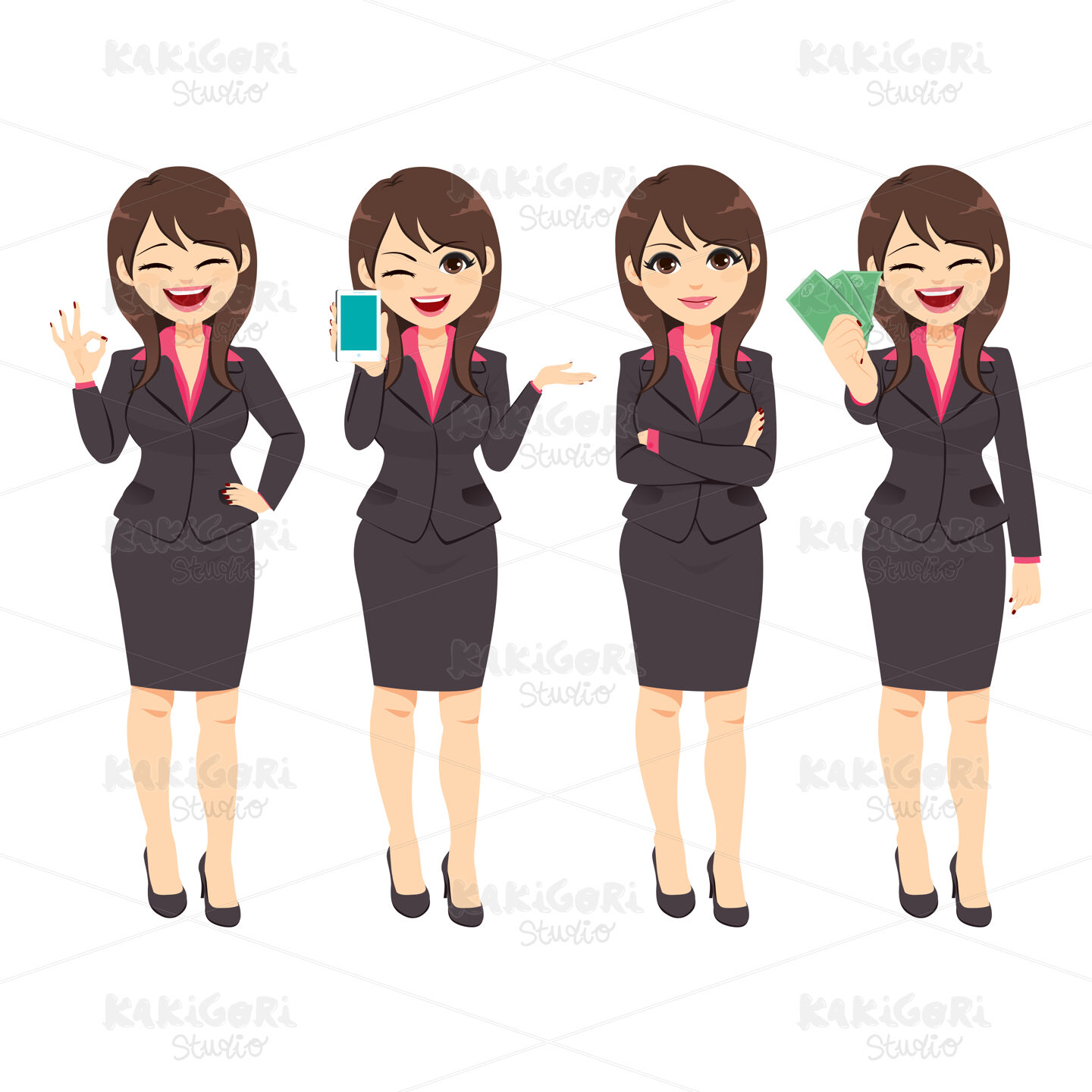 Beautiful businesswoman working character on different poses holding different office accessories