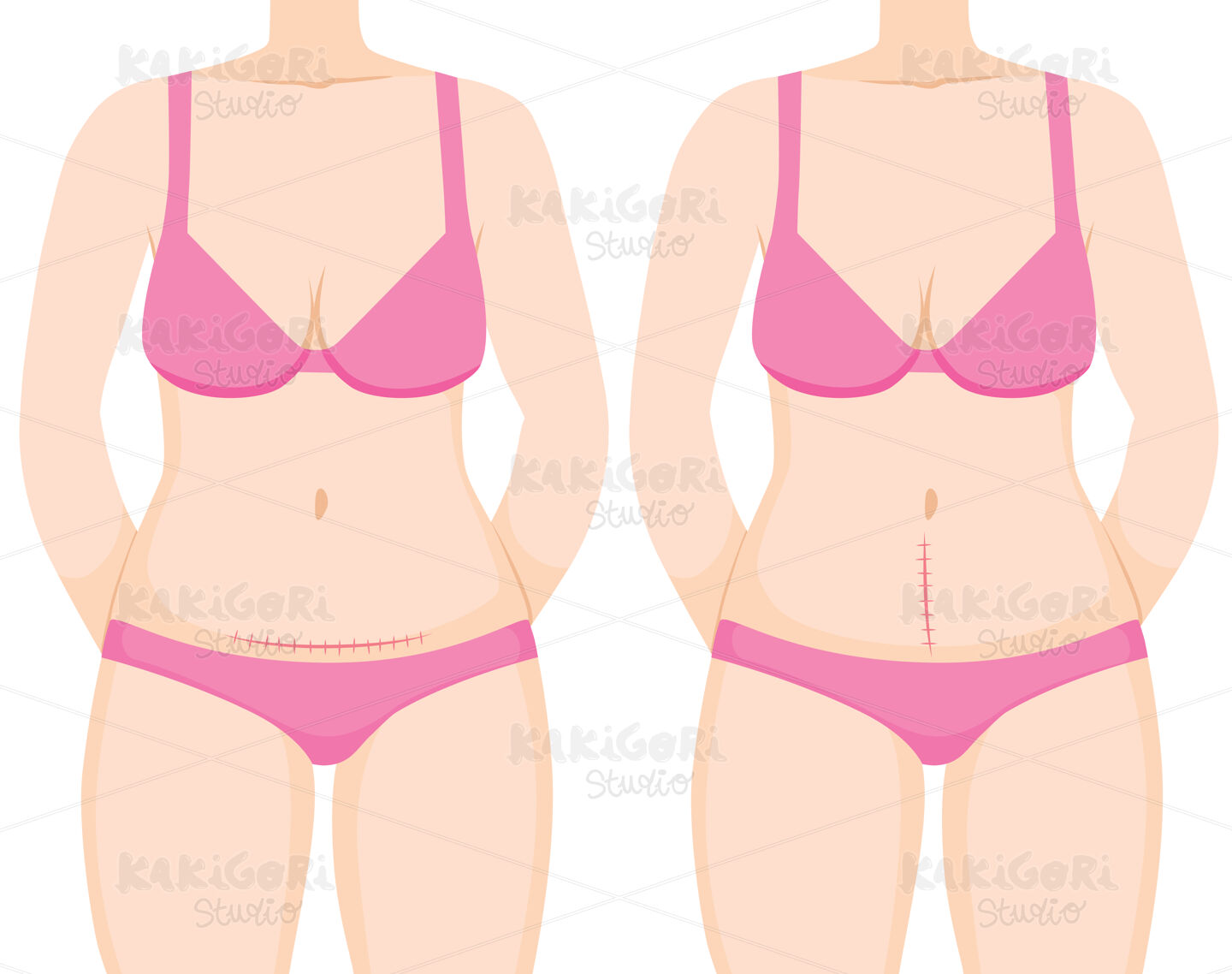 Woman body showing c section cesarean operation with vertical and horizontal scar