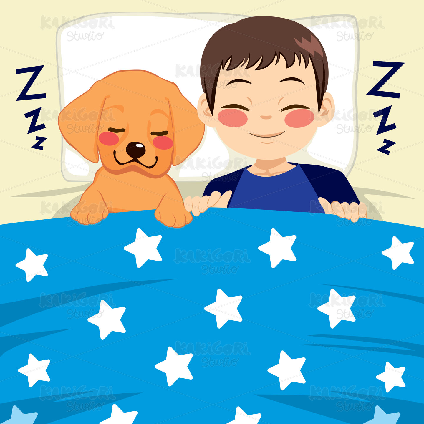 Cute little child and labrador puppy dog sleeping together on bed with starry blue blanket friendship concept