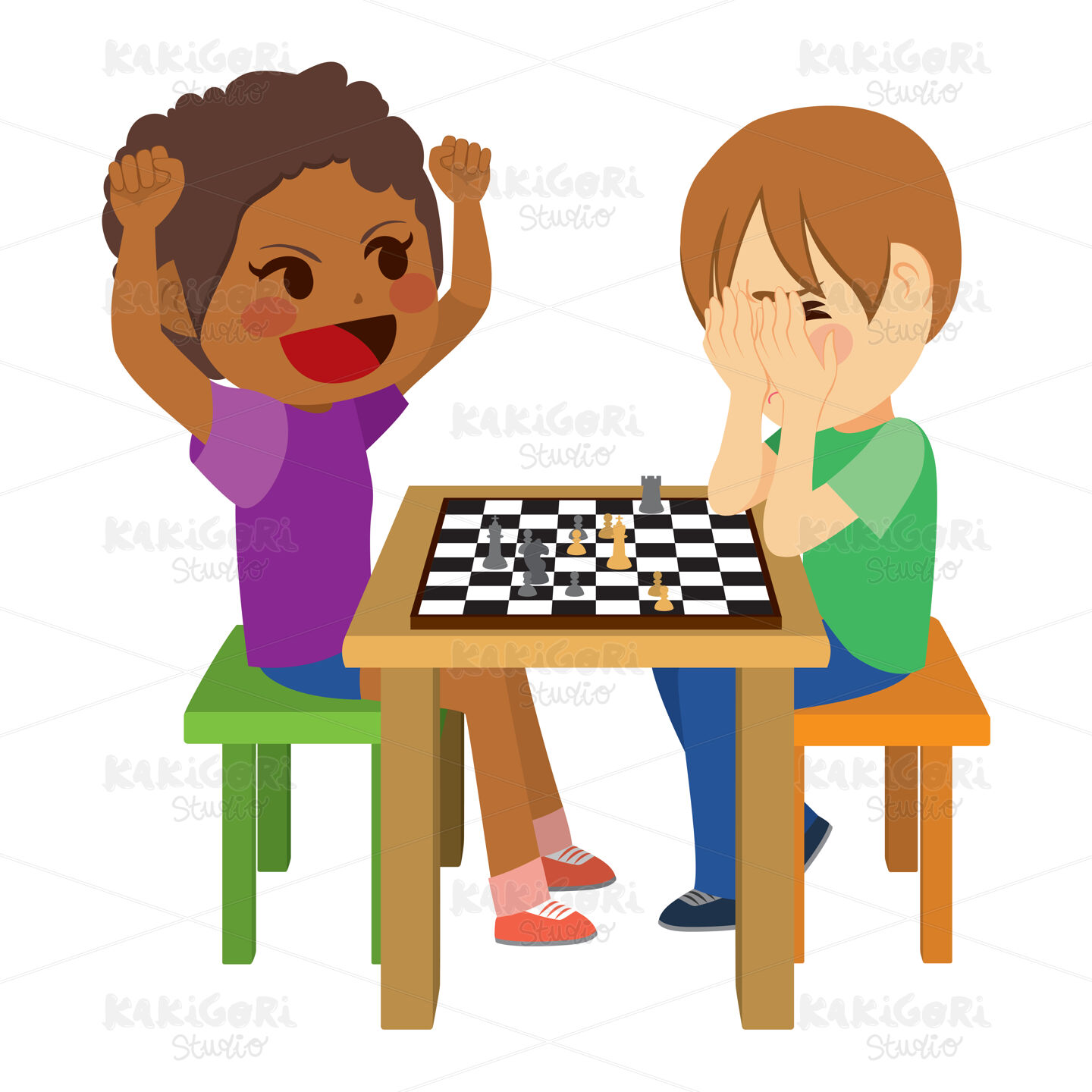 Two cute children playing chess with happy winning girl with arms up and sad boy losing covering face