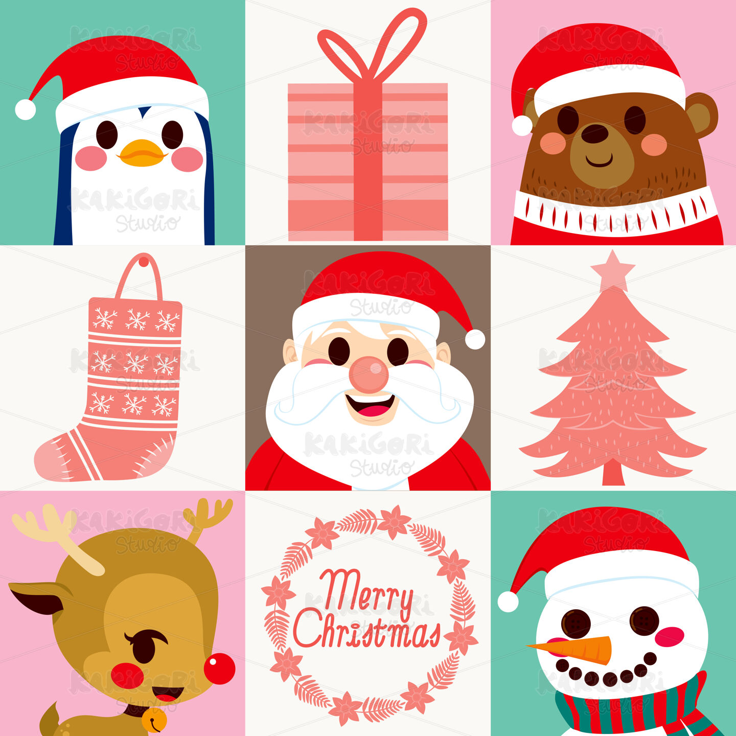 Cute Santa Claus character with lovely animal and Christmas elements cards set collection