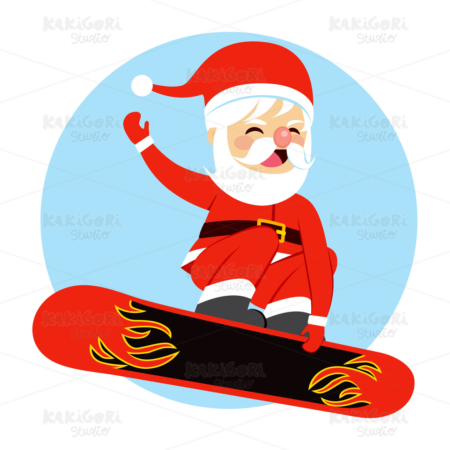 Illustration of happy cute Santa Claus snowboarding on Christmas eve