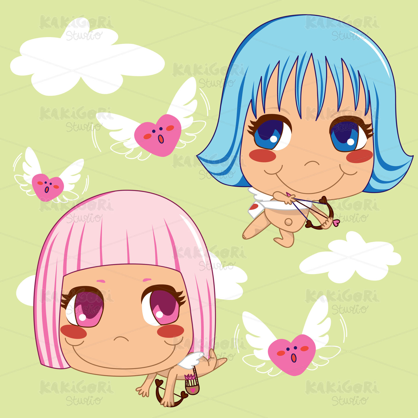 Pink and Blue haired Cupid helpers hunting flying hearts of love for Valentine day celebration
