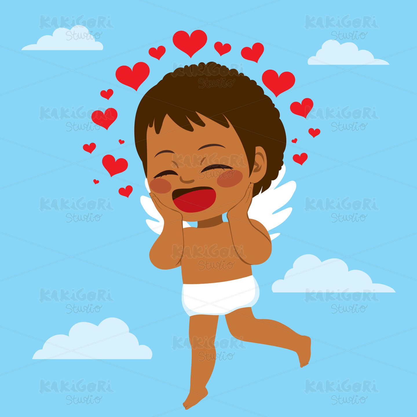 Cute Black Cupid character flying on blue sky and surrounded with hearts