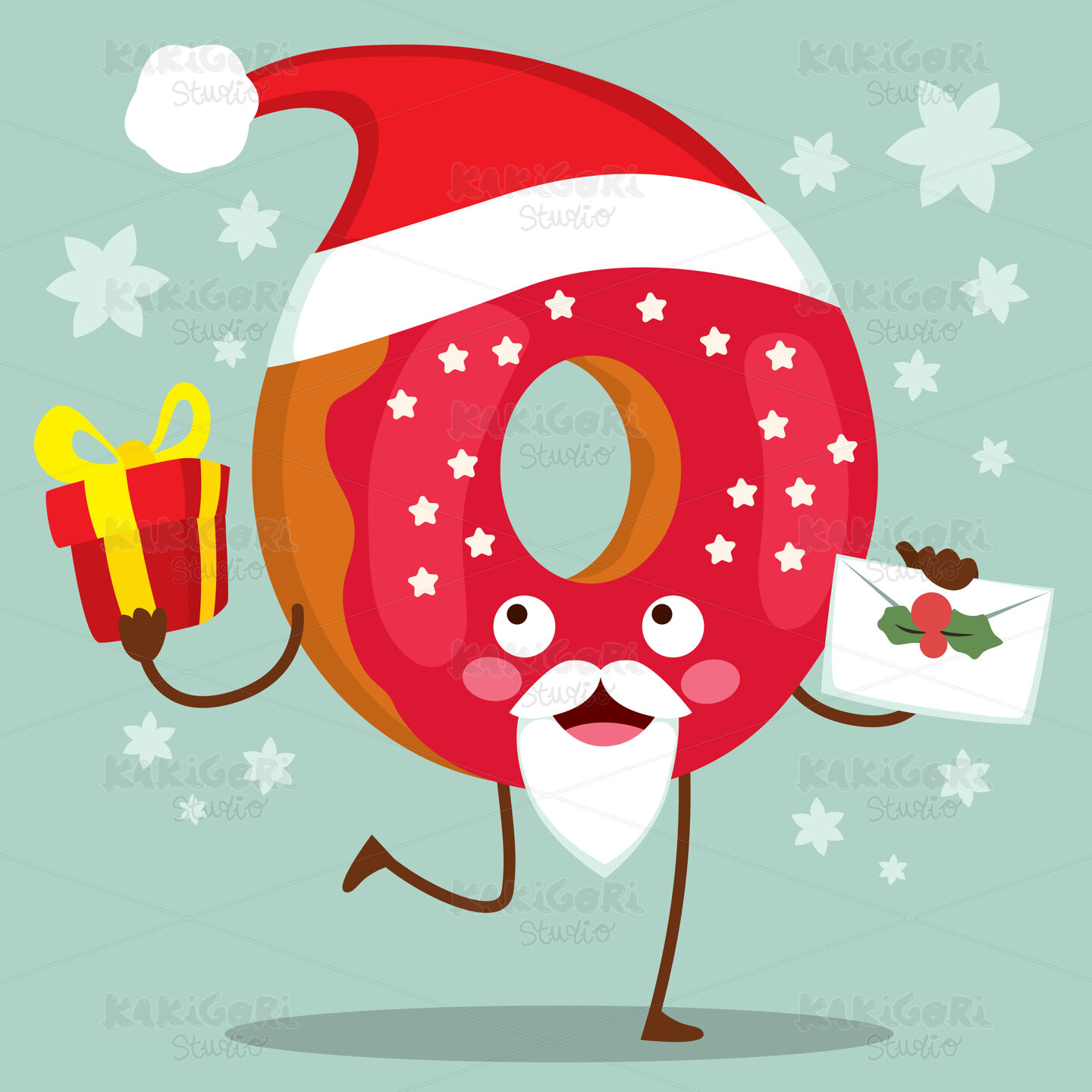 Cute doughnut character with Christmas Santa Claus hat and red frosted icing holding present and letter