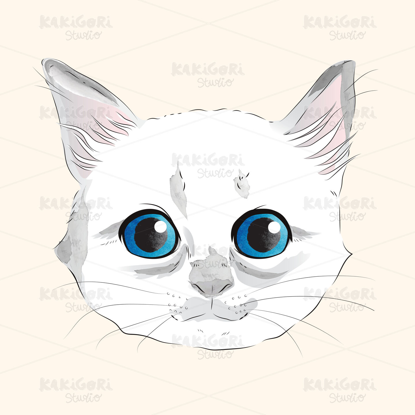 Watercolor illustration of cute white kitty head with blue eyes