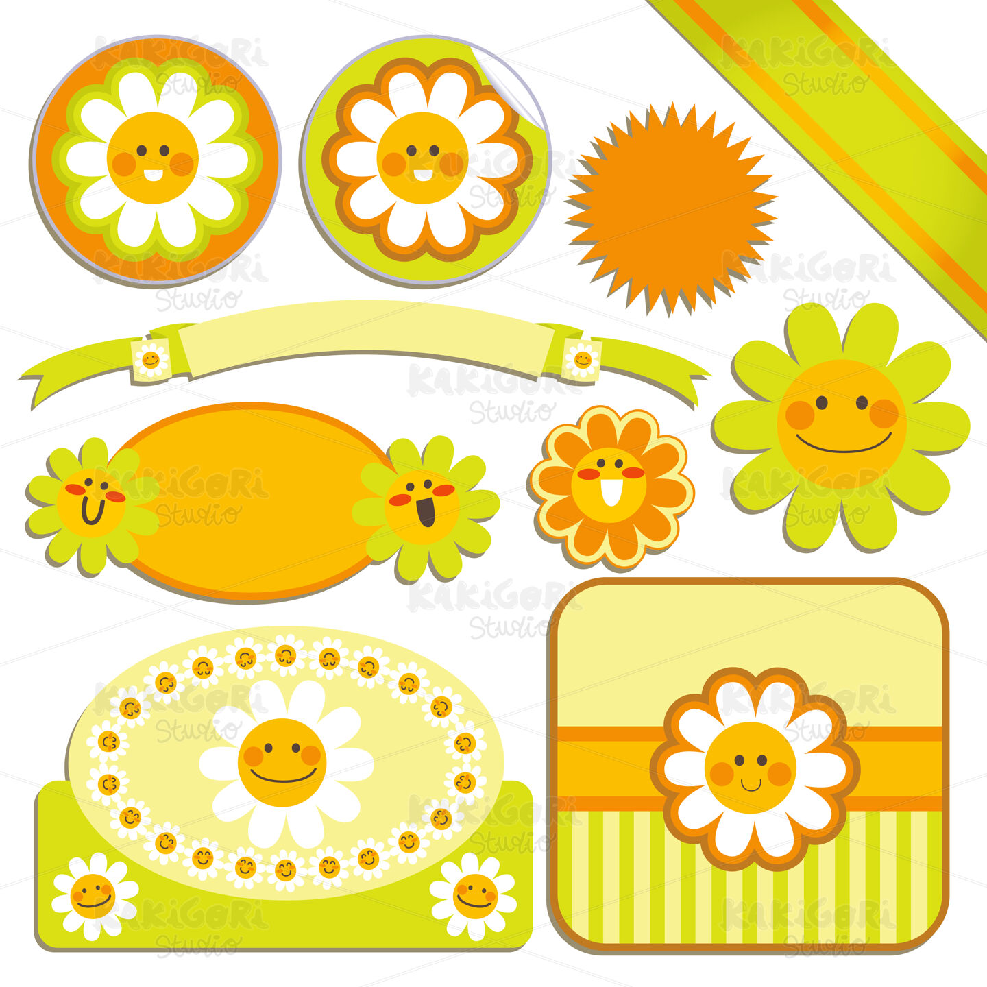 Collection of cute daisy flower template labels and stickers in green and orange