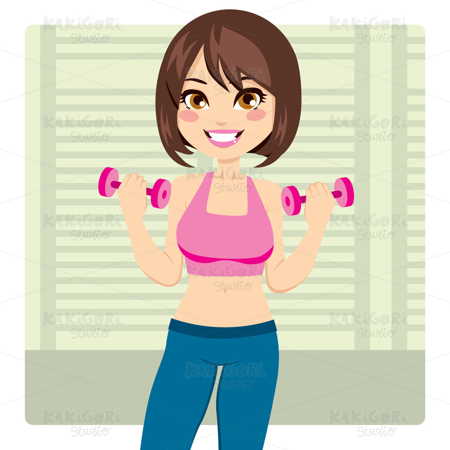Beautiful and fit brunette woman exercising with two dumbbell weights on her hands