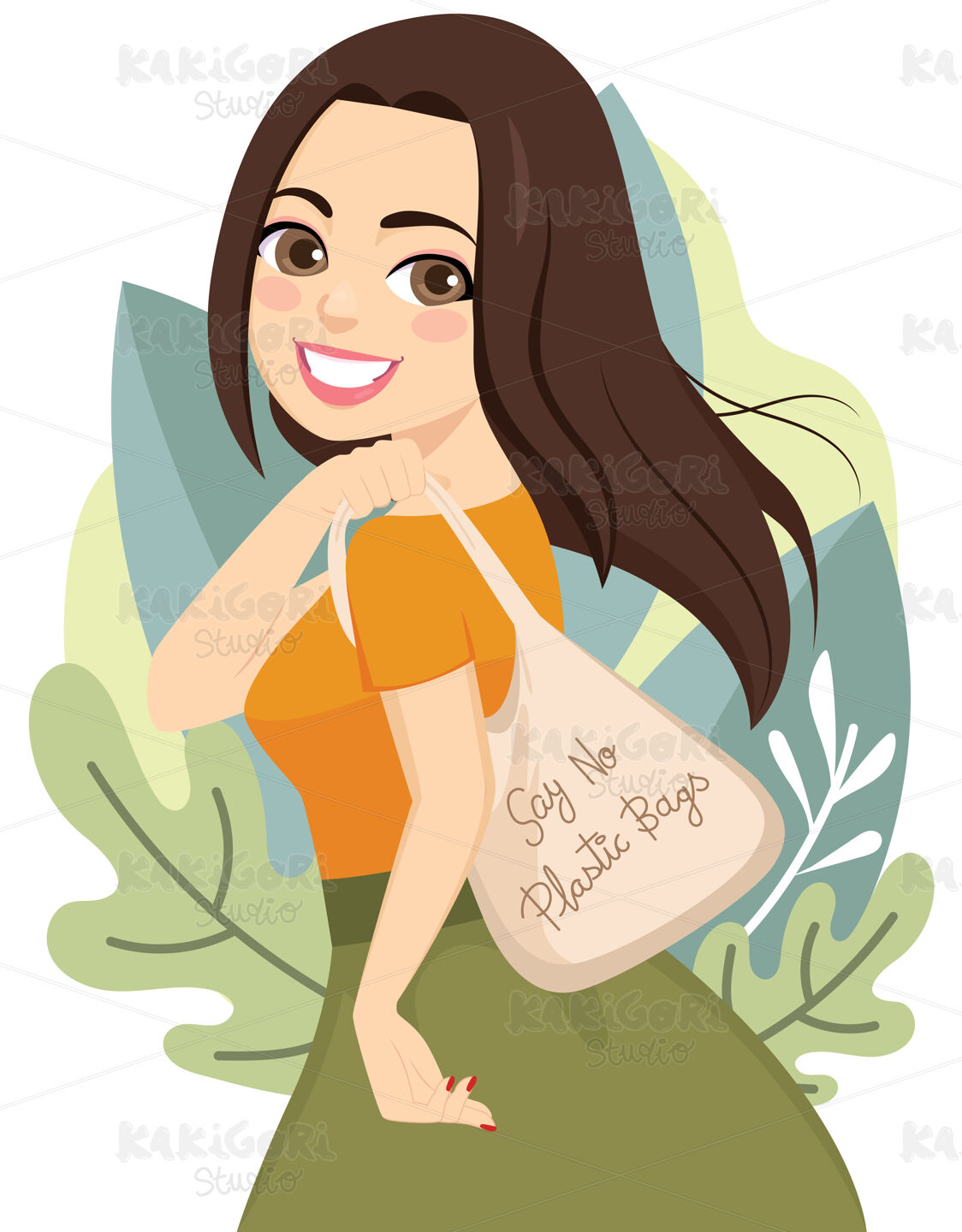 / Eco Green Cotton Bag Woman Clipart Vector Illustration 05023