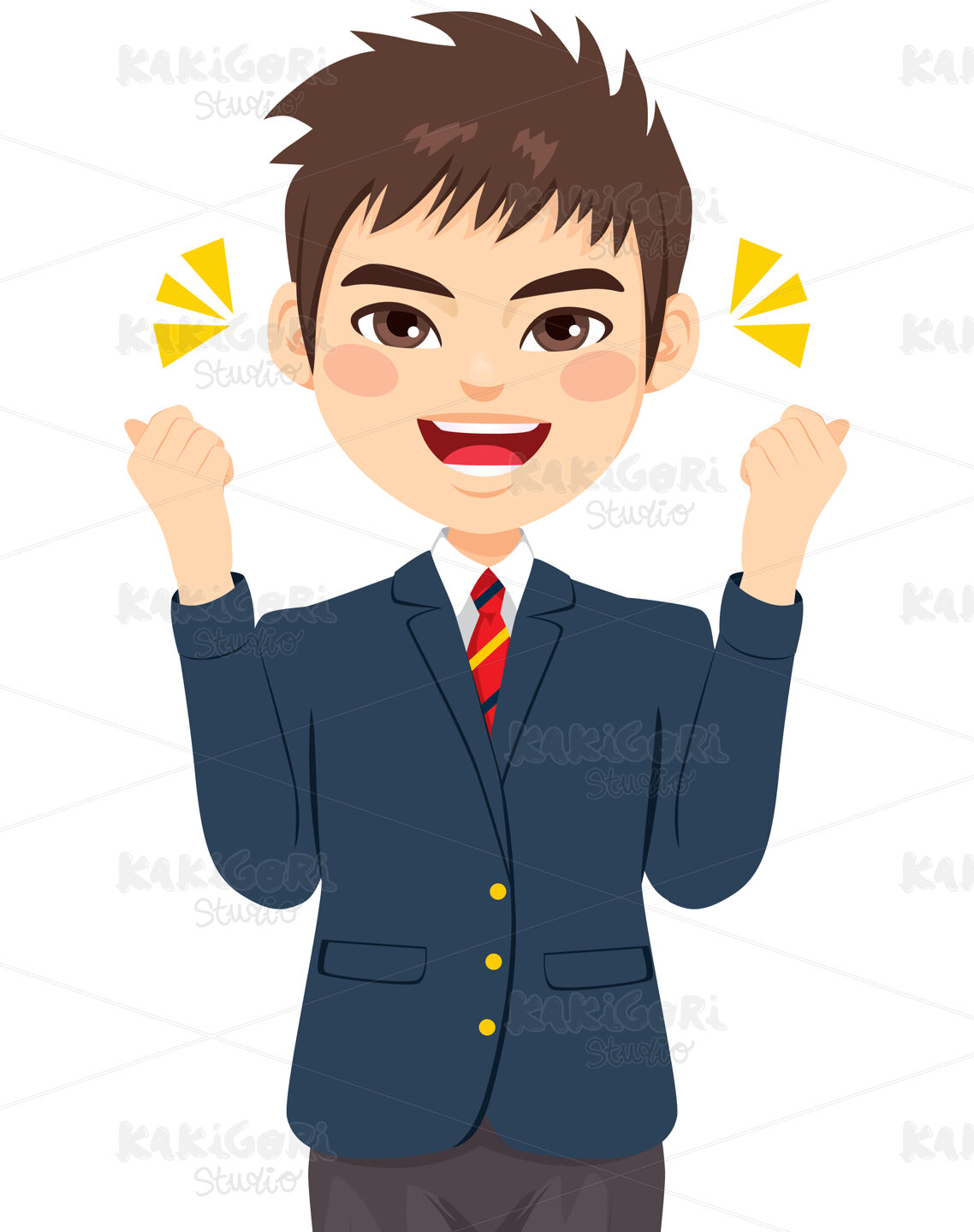 Happy cheerful young boy smiling energetic face expression with fists up wearing blue uniform