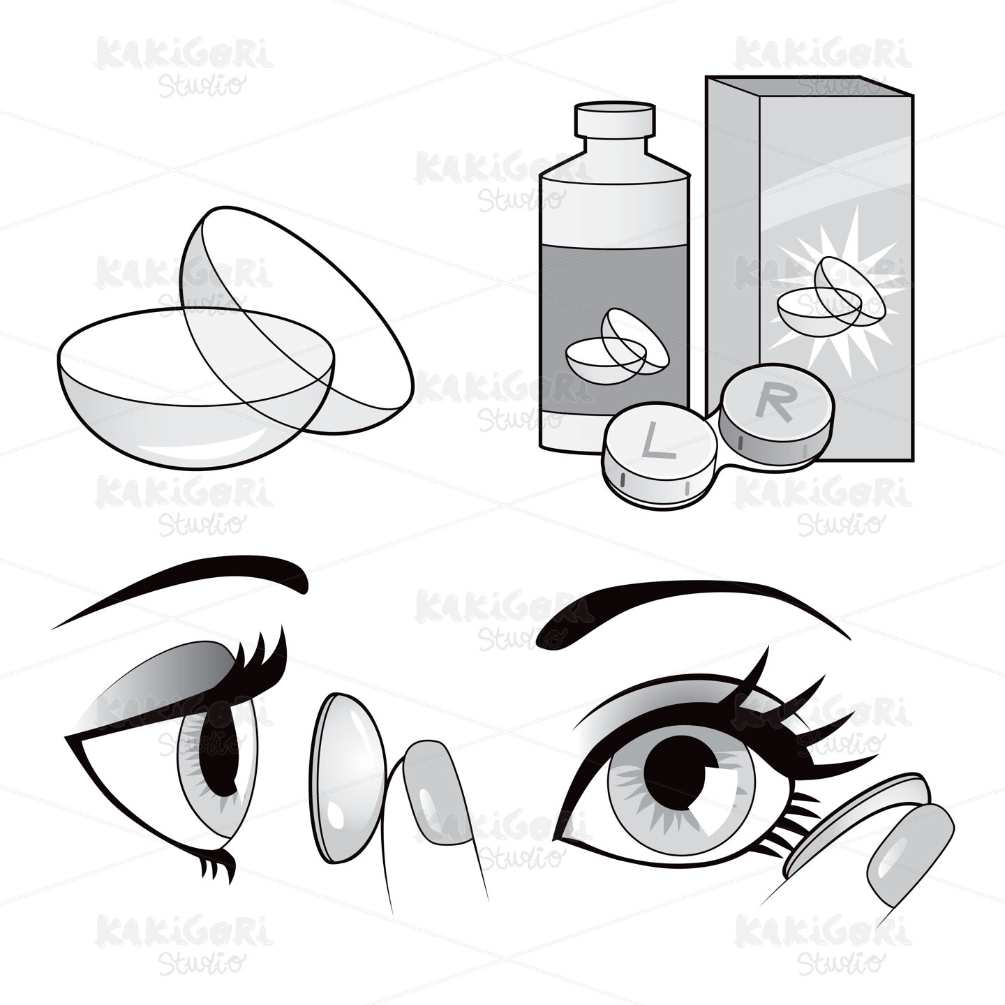 Black and white eye contact lenses elements collection with actions applying contacts to the eye