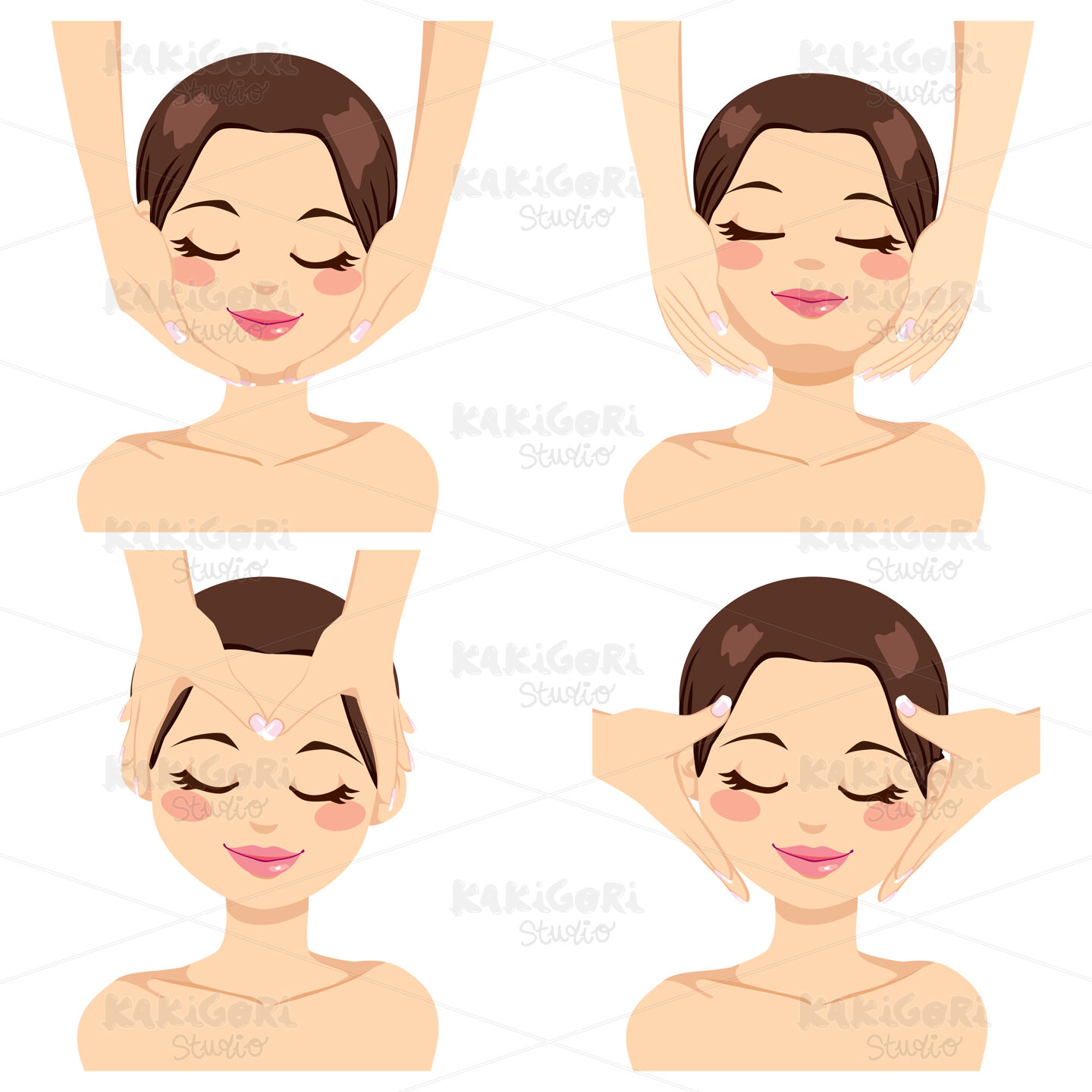Collection of four different facial massage techniques on beautiful brunette young woman isolated on white background