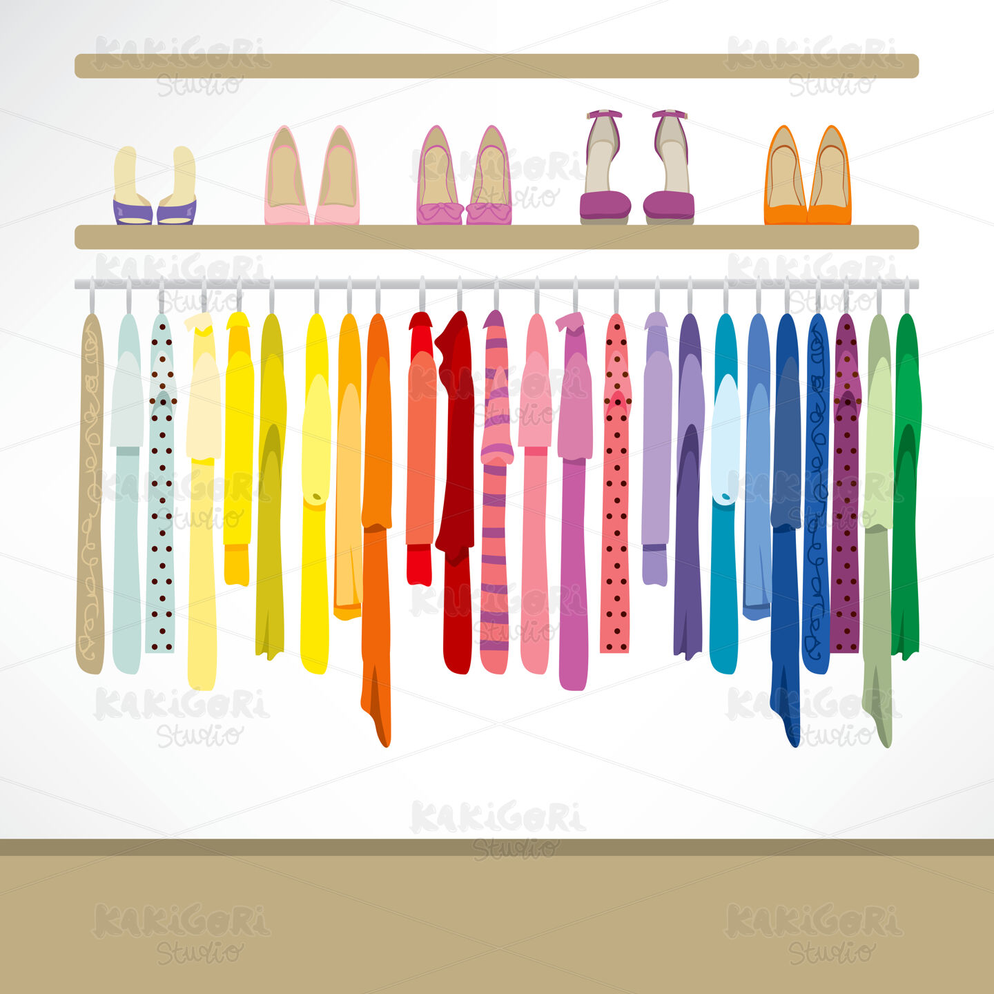 Fashion shop background with clothing on hangers, shirts, dresses and shoes