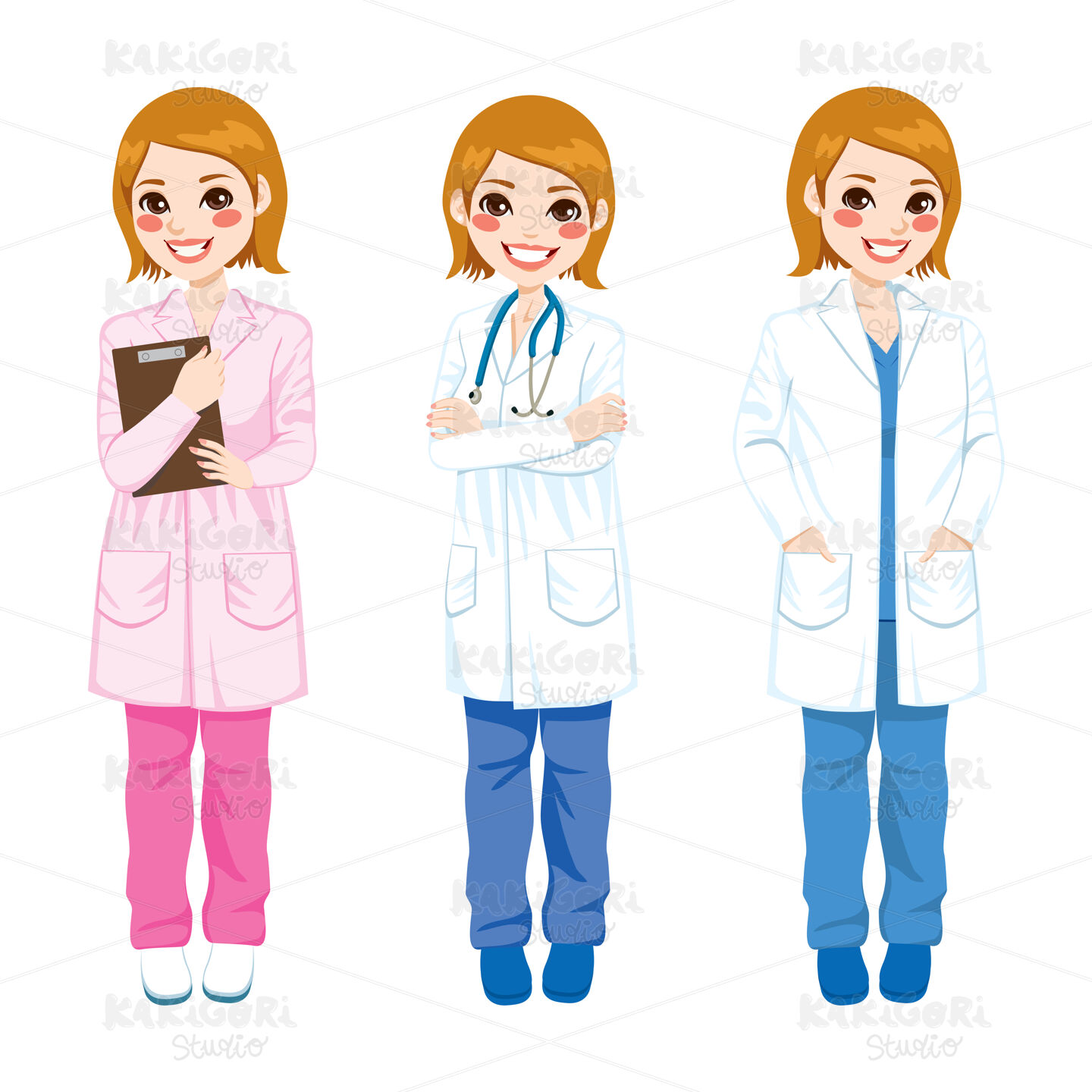 Beautiful young female doctor on three different poses and different color uniform