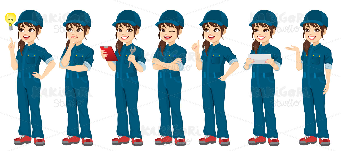 Young auto repair female mechanic standing posing with different gestures and holding different objects and tools