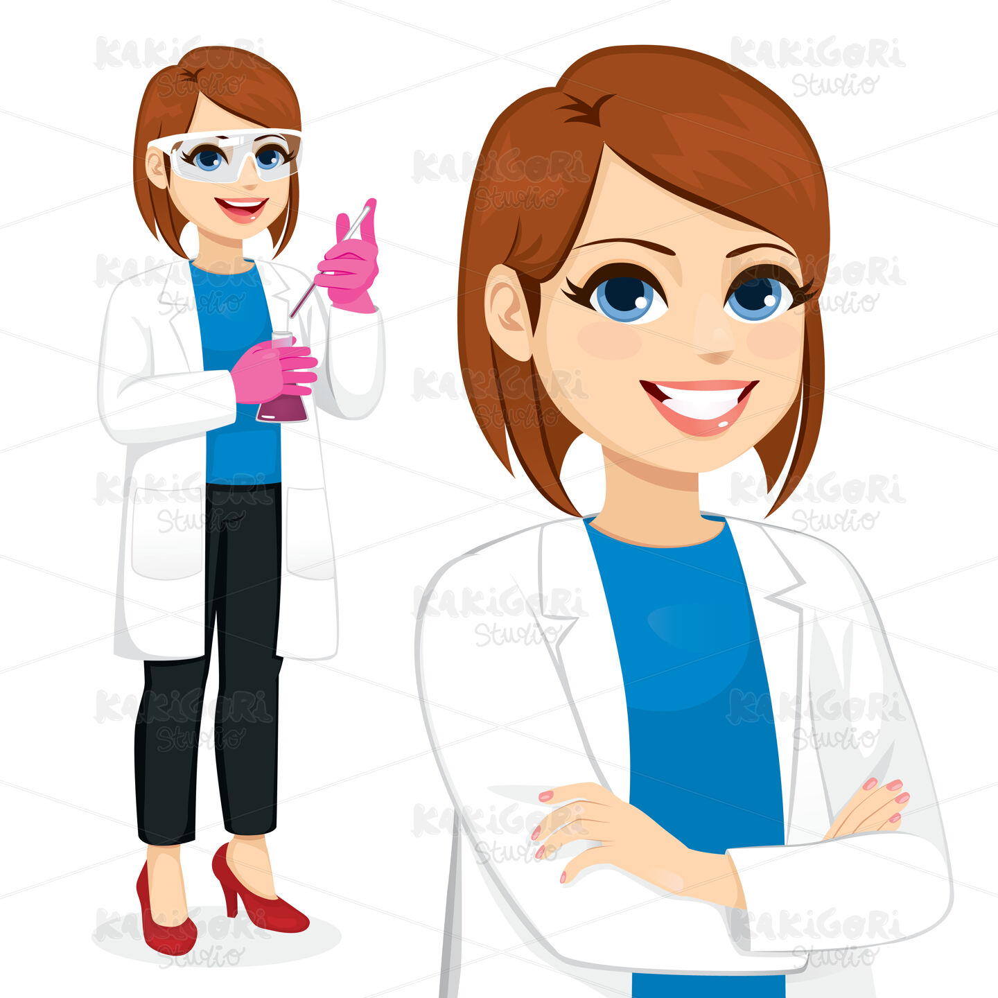 Female scientist with glasses and gloves working using pipette on test tube and crossed arms closeup