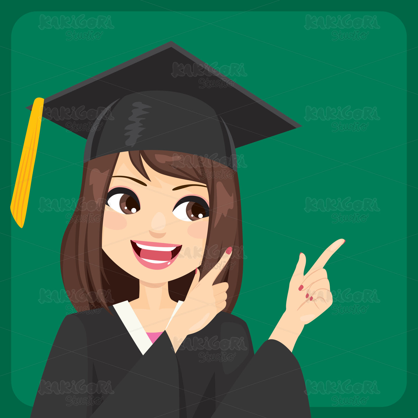 Female student in graduation gown and mortarboard cap pointing at side with both hands on the green board