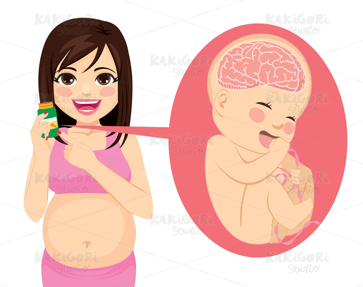 Young pregnant mother holding folic acid bottle medicine supplement for baby growth brain