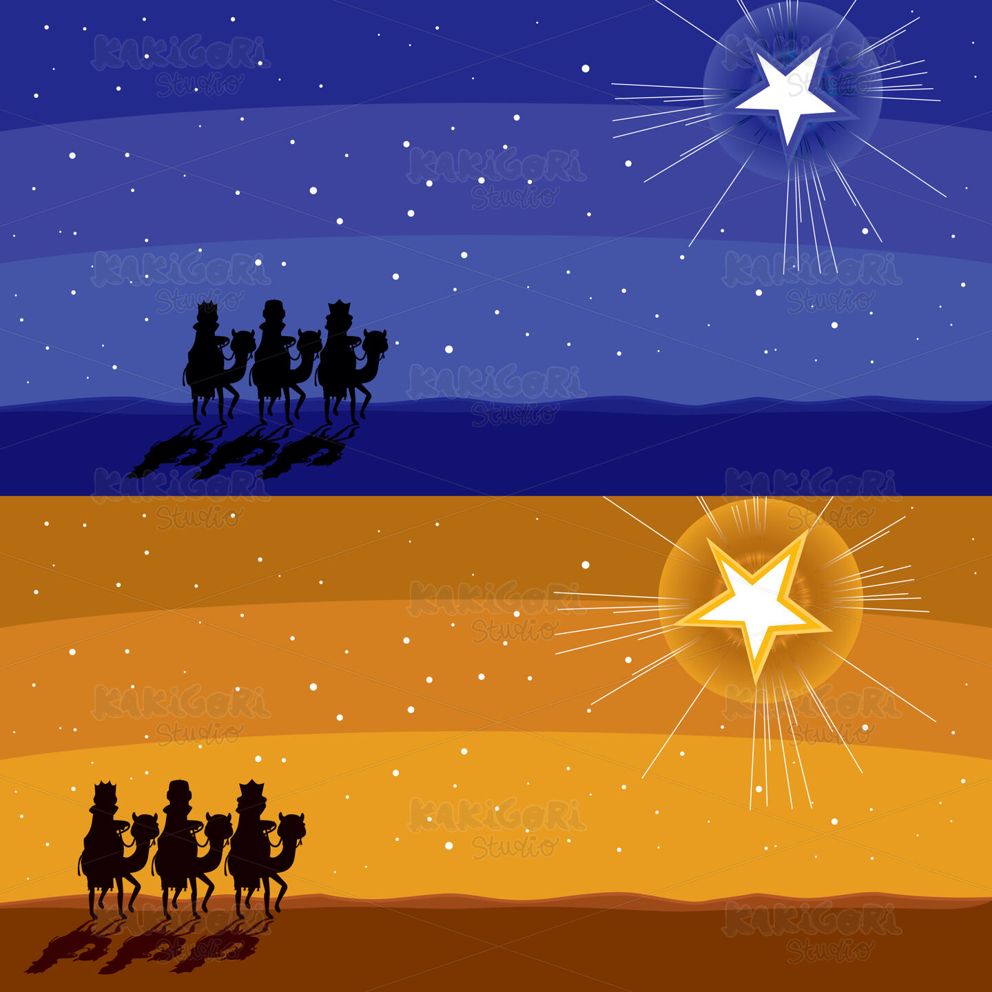Two different color Christmas banner of three kings silhouette following shining star