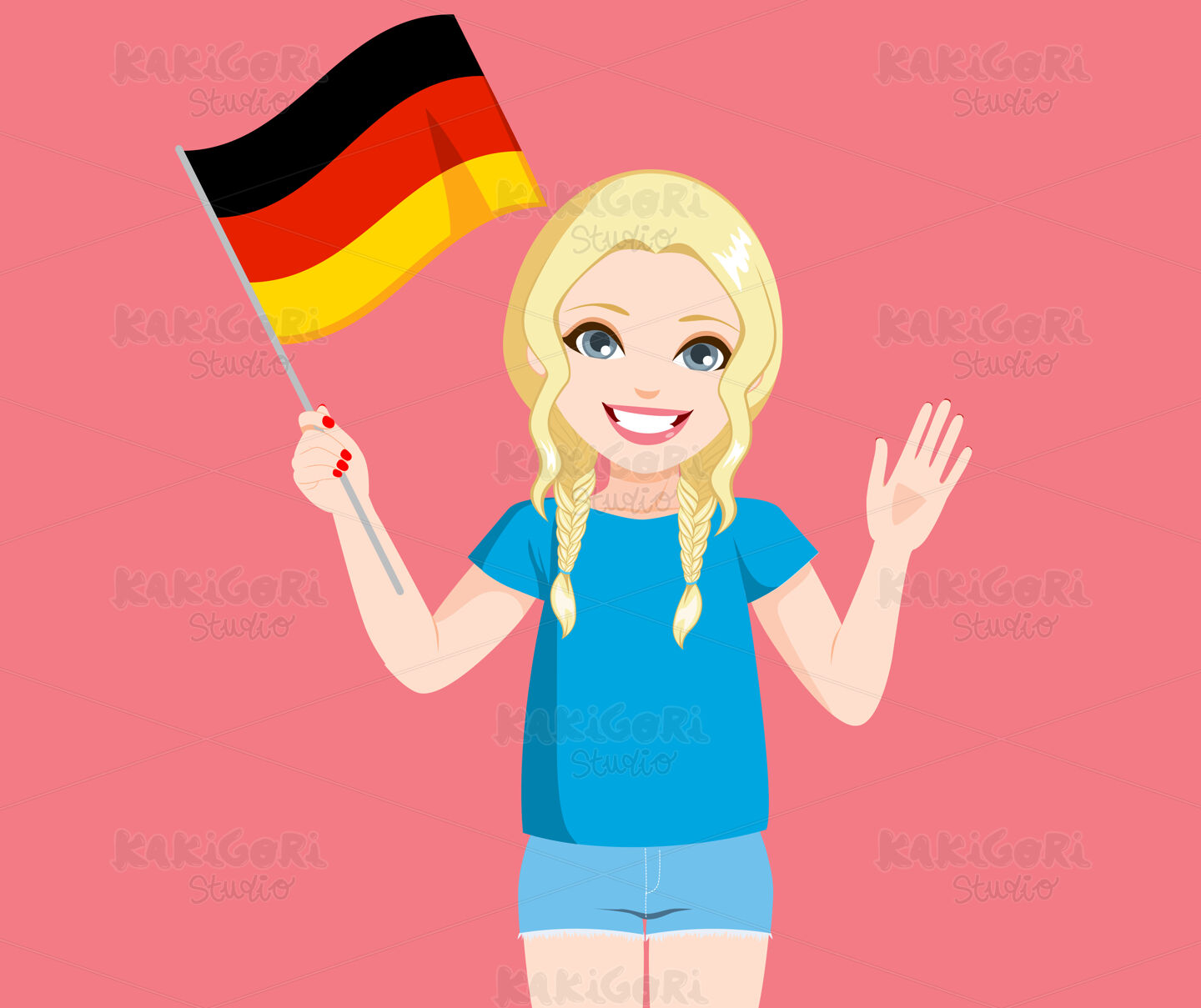 Beautiful young blonde german woman holding Germany flag and waving hand on pink background