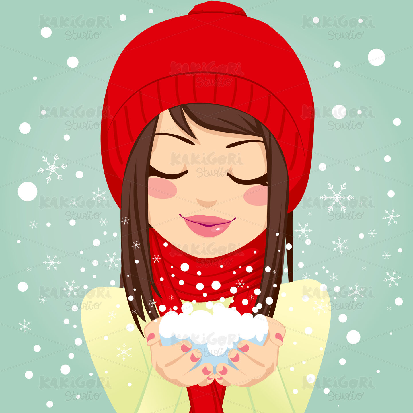 Beautiful brunette girl with eyes closed holding snow on her hands softly blowing snowflakes