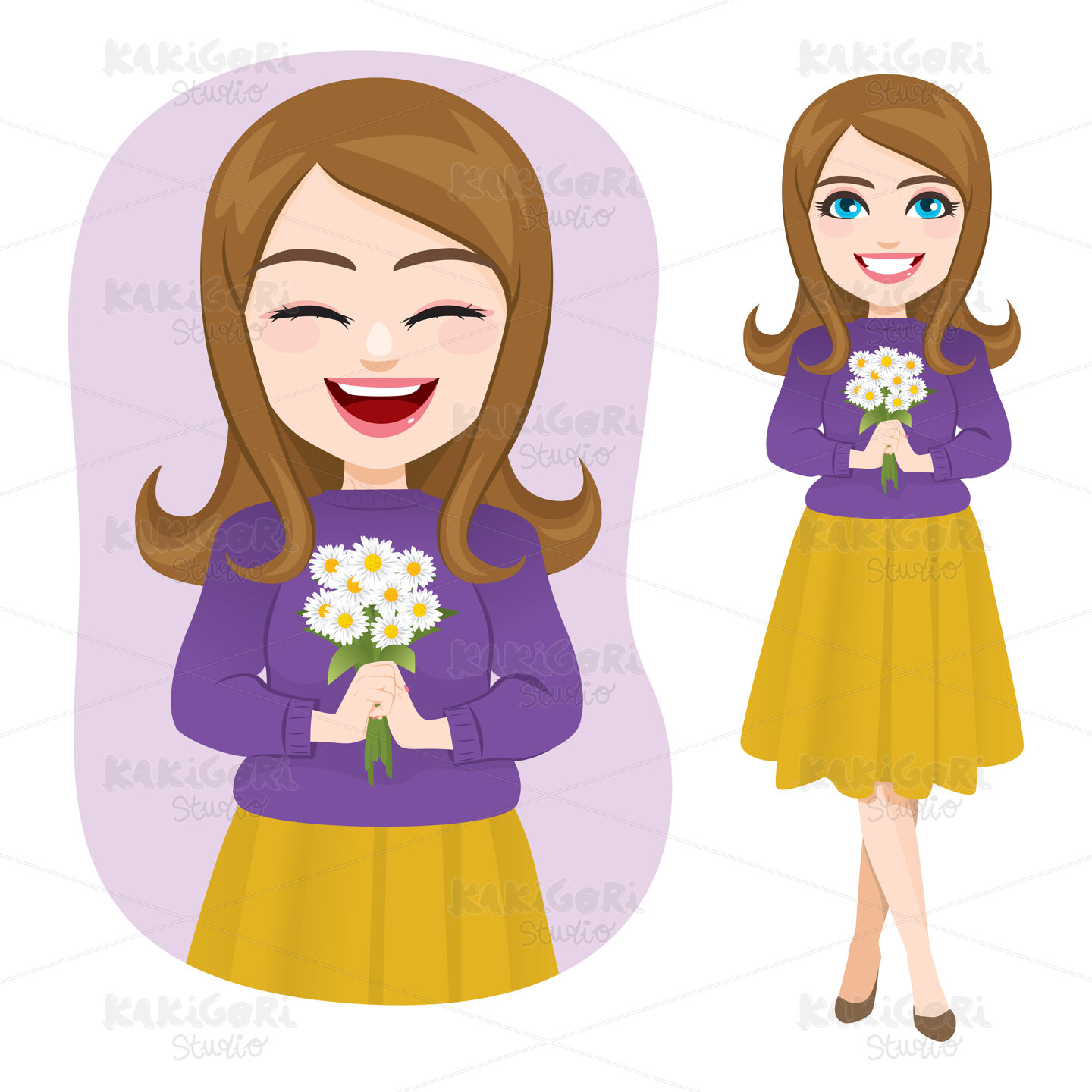 / Girl Holding Daisy Flowers Bouquet Clipart Vector Illustration 04745