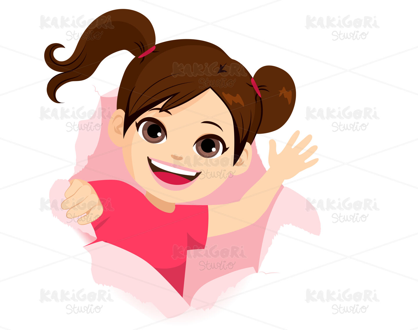 / Girl Waving Through Paper Hole Clipart Vector Illustration 05528